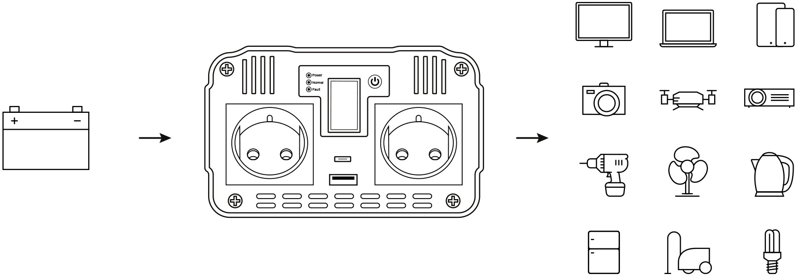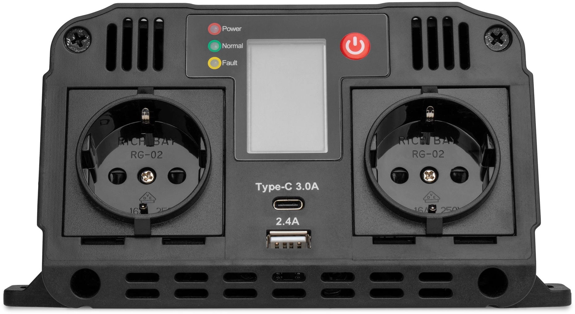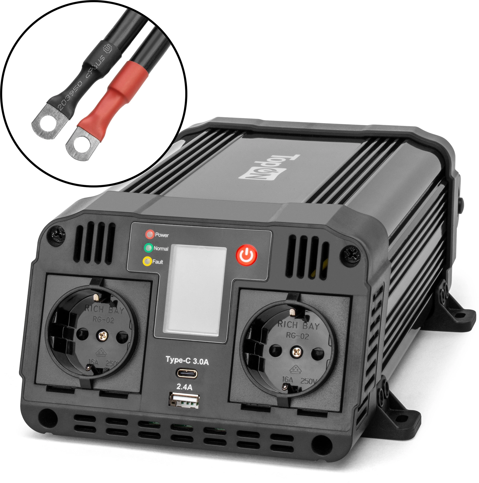 | Особенности | Модифицированная синусоида (MSW), порты Type-C и USB, LCD-экран, активное охлаждение, отслеживание ёмкости аккумулятора, медные контакты с огнестойкой оболочкой, крепления для фиксации инвертора, 3 предохранителя по 40A, контакт заземления, звуковое предупреждение, система электрических защит. |