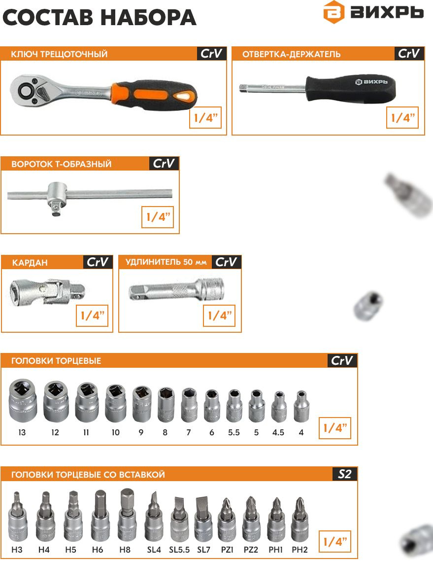 | Дополнительно в наборе, 1/4"DR | вороток Т-образный, карданный шарнир, отверточная рукоятка. |