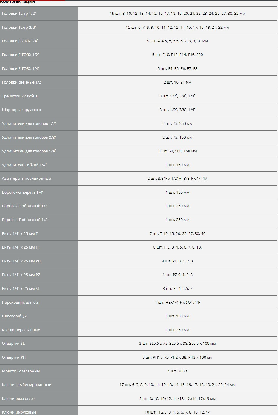 | Комбинированные ключи, список | 6, 7, 8, 9, 10, 11, 12, 13, 14, 15, 16, 17, 18, 19, 21, 22, 24 мм |