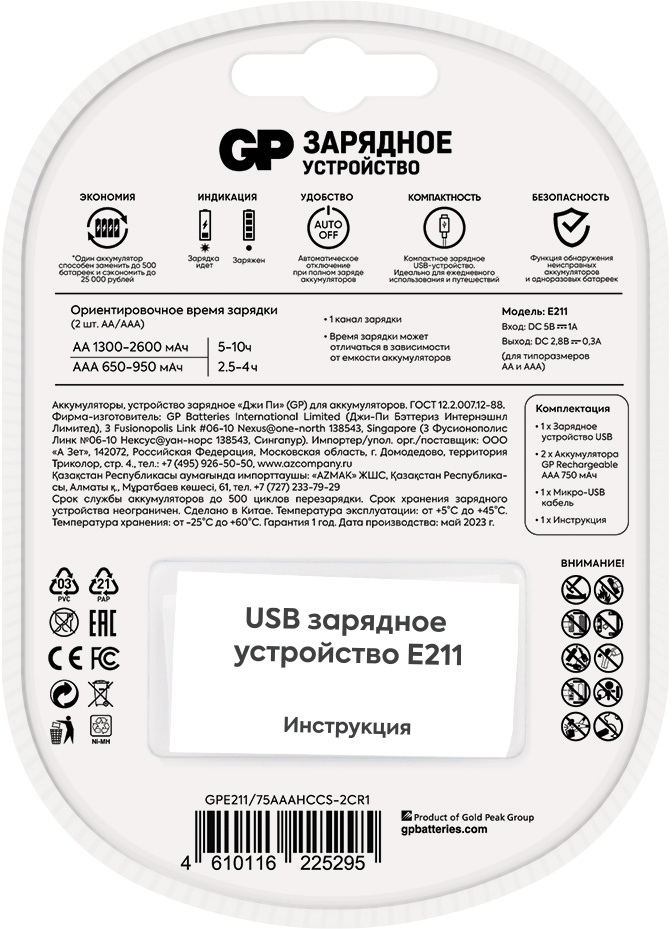 Зарядное устройство GP Rechargeable E211/75AAAHCCS-2CR1 AA/AAA NiMH 750mAh (2шт) блистер