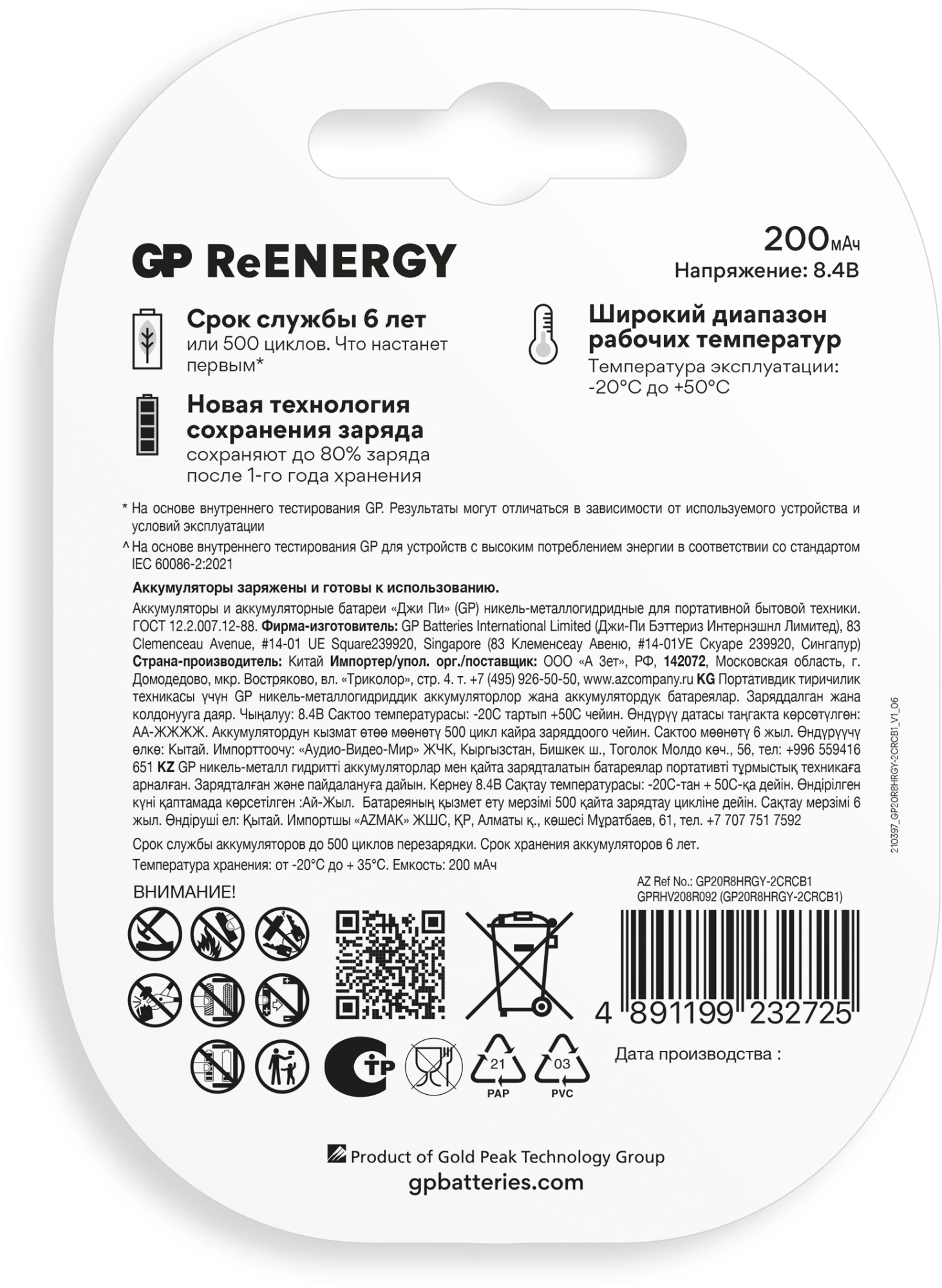 Аккумулятор GP 20R8H 9V Крона 9V NiMH 200mAh (1шт)