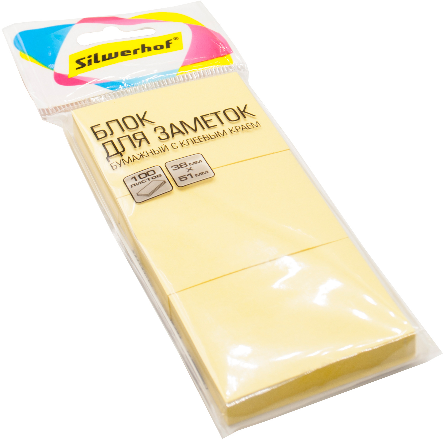 Блок самоклеящийся бумажный Silwerhof 38x51мм 100лист. 75г/м2 пастель желтый европодвес (упак.:3шт)