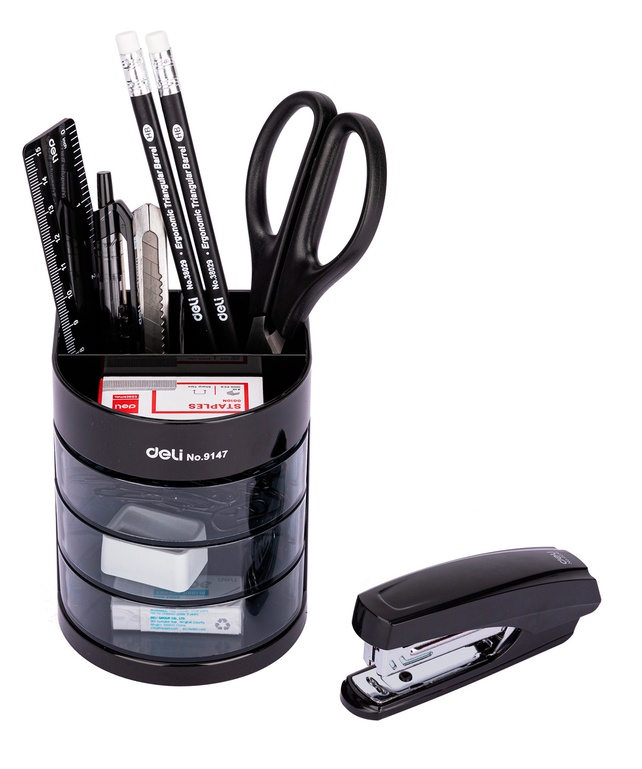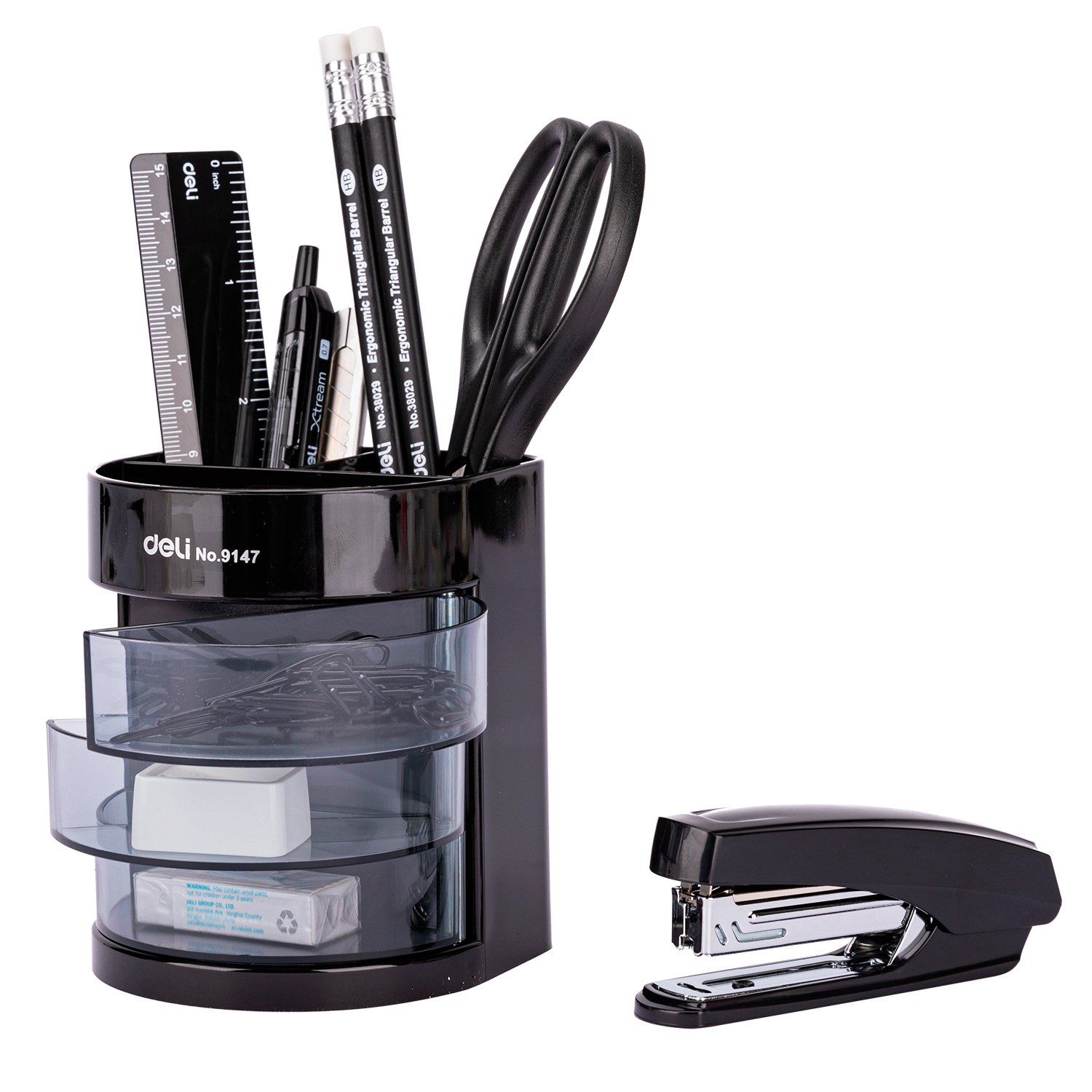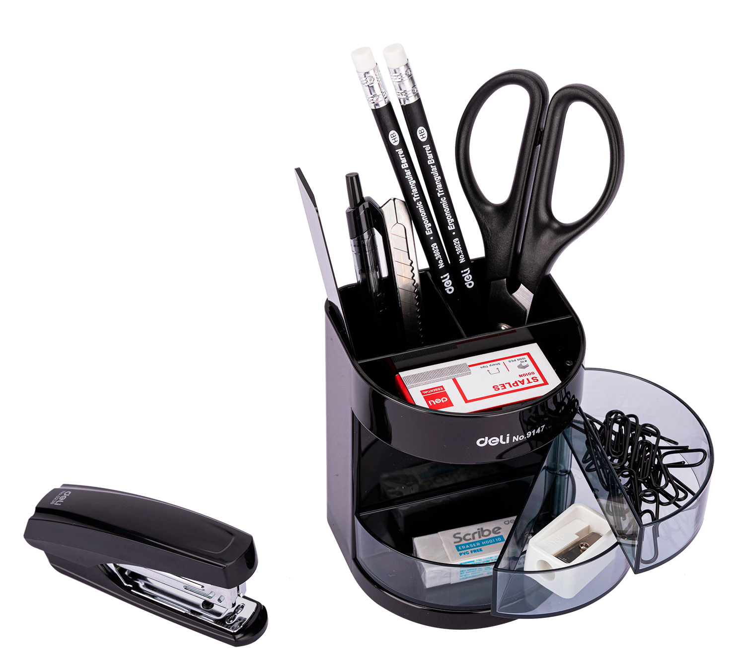 | Состав набора | Подставка для пишущих предметов с выдвижными отделами для мелкоофисных принадлежностей, линейка, ножницы, нож канцелярский, степлер, скобы, ручка, два карандаша, скрепка, ластик, точилка, точилка. |