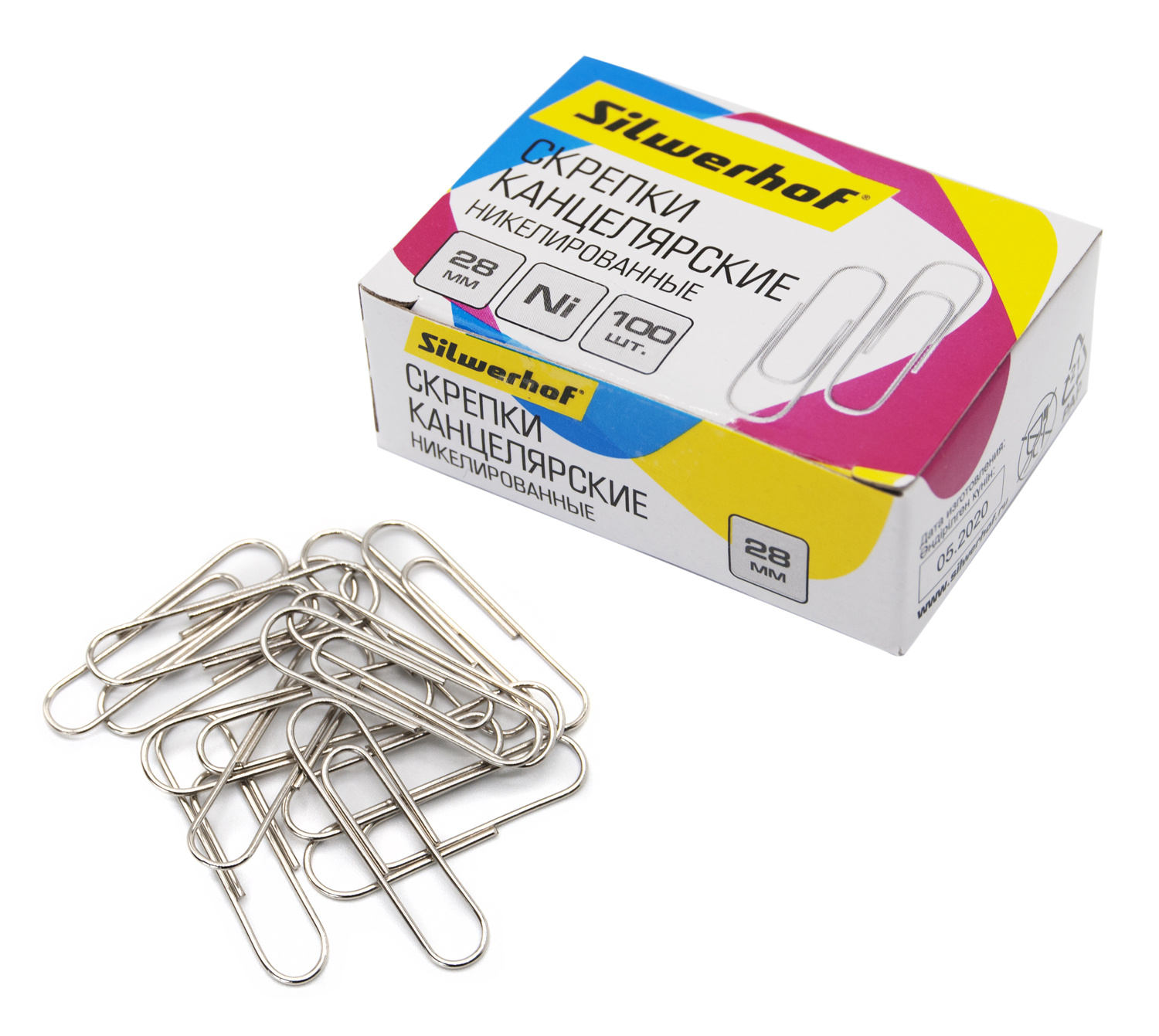 Скрепки Silwerhof 194041 никель 28мм (упак.:100шт) картонная коробка (10 шт. в упаковке)