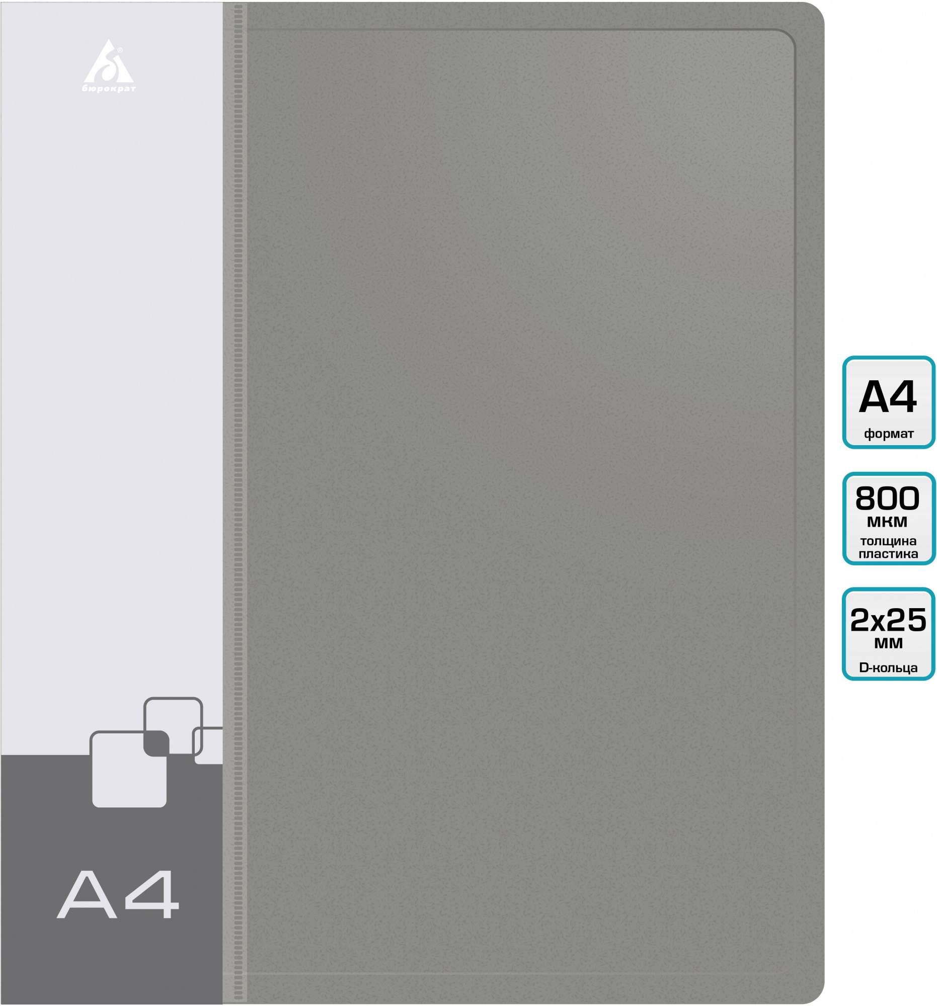 Папка на 2-х D-кольцах Бюрократ -0840/2DGREY A4 пластик 0.8мм кор.40мм внутр. с вставкой серый (16 шт. в упаковке)