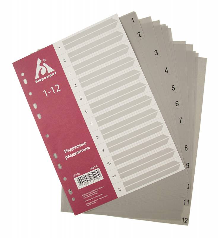 Разделитель индексный Бюрократ ID106 A4 пластик 1-12 с бумажным оглавлением серые разделы (10 шт. в упаковке)