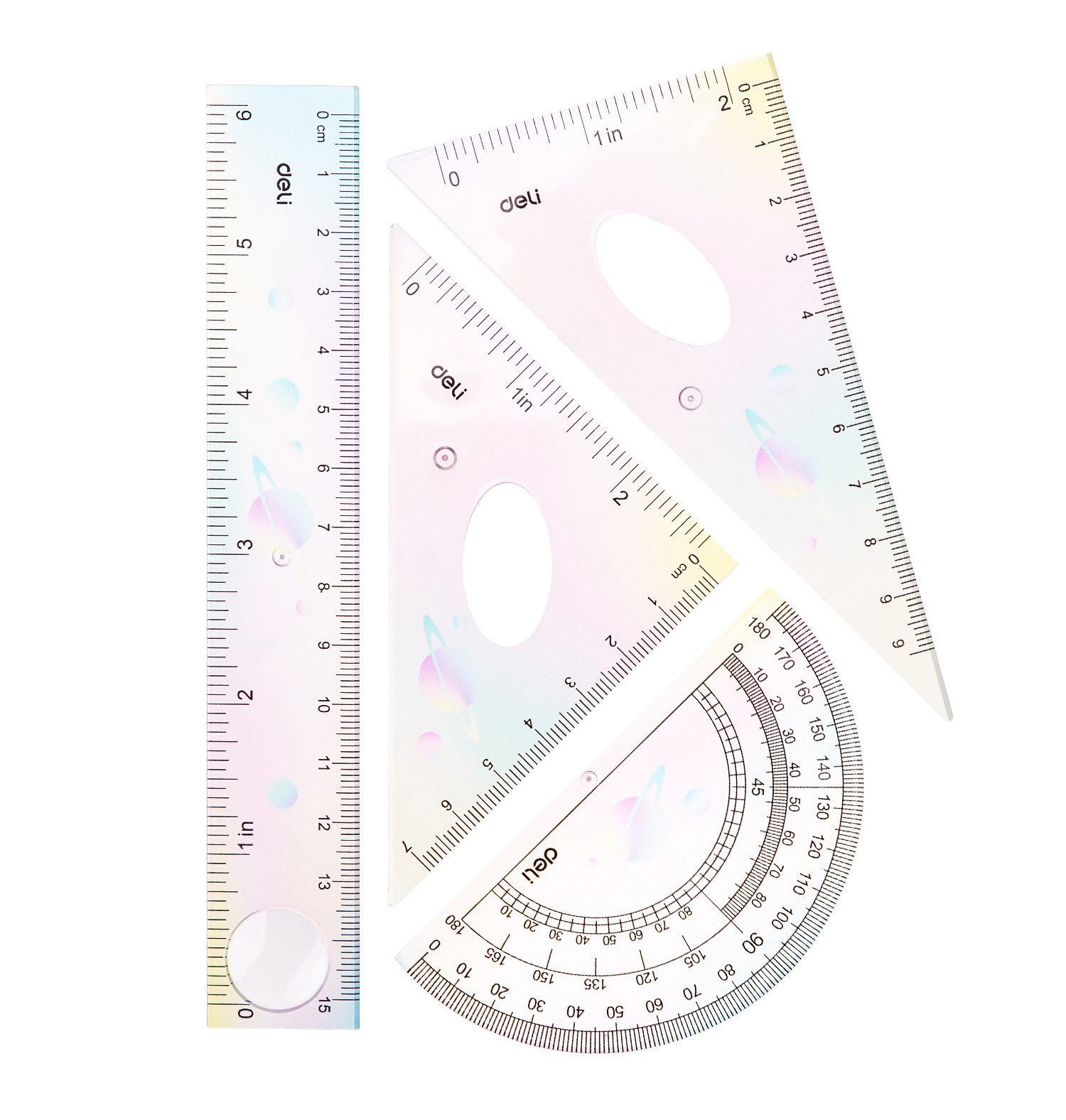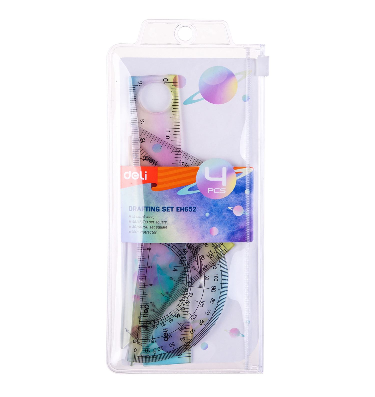 Набор линеек Deli EH652 пластик дл.15см ассорти компл.:лин 15см/2 угольн/трансп пластиковый пакет с европодв. (24 шт. в упаковке)