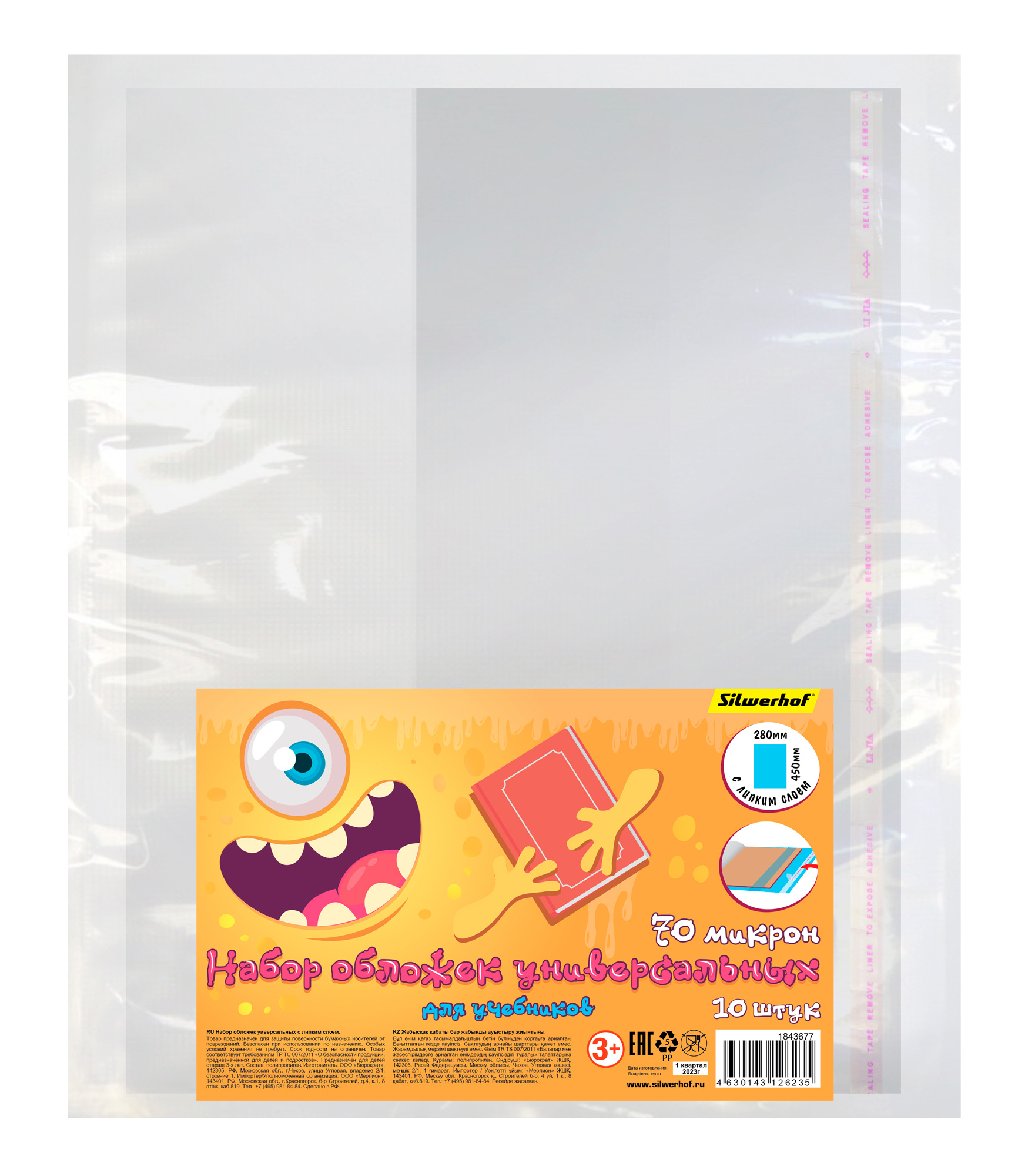 Обложка Silwerhof 382176 Монстрики для учебника с липк.сл. (набор 10шт) ПП 70мкм гладкая прозр. 280х450мм (10 шт. в упаковке)