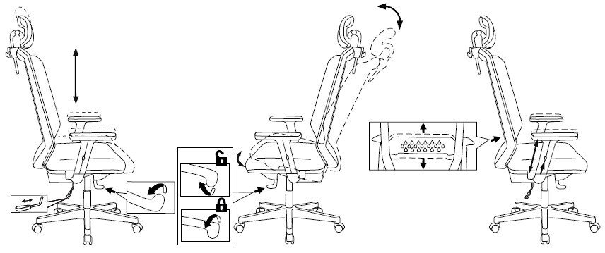 | Регулировка | высоты (газлифт), высоты подголовника, положения подлокотников, поясничной области, угла наклона подголовника |