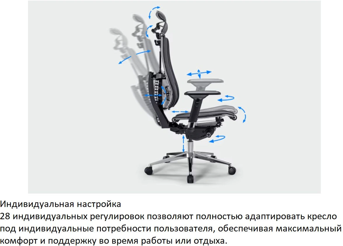 | Регулировка | высоты (газлифт), высоты подголовника, высоты подлокотников, глубины сиденья, наклона спинки, положения подлокотников, поясничной области, угла наклона подголовника |