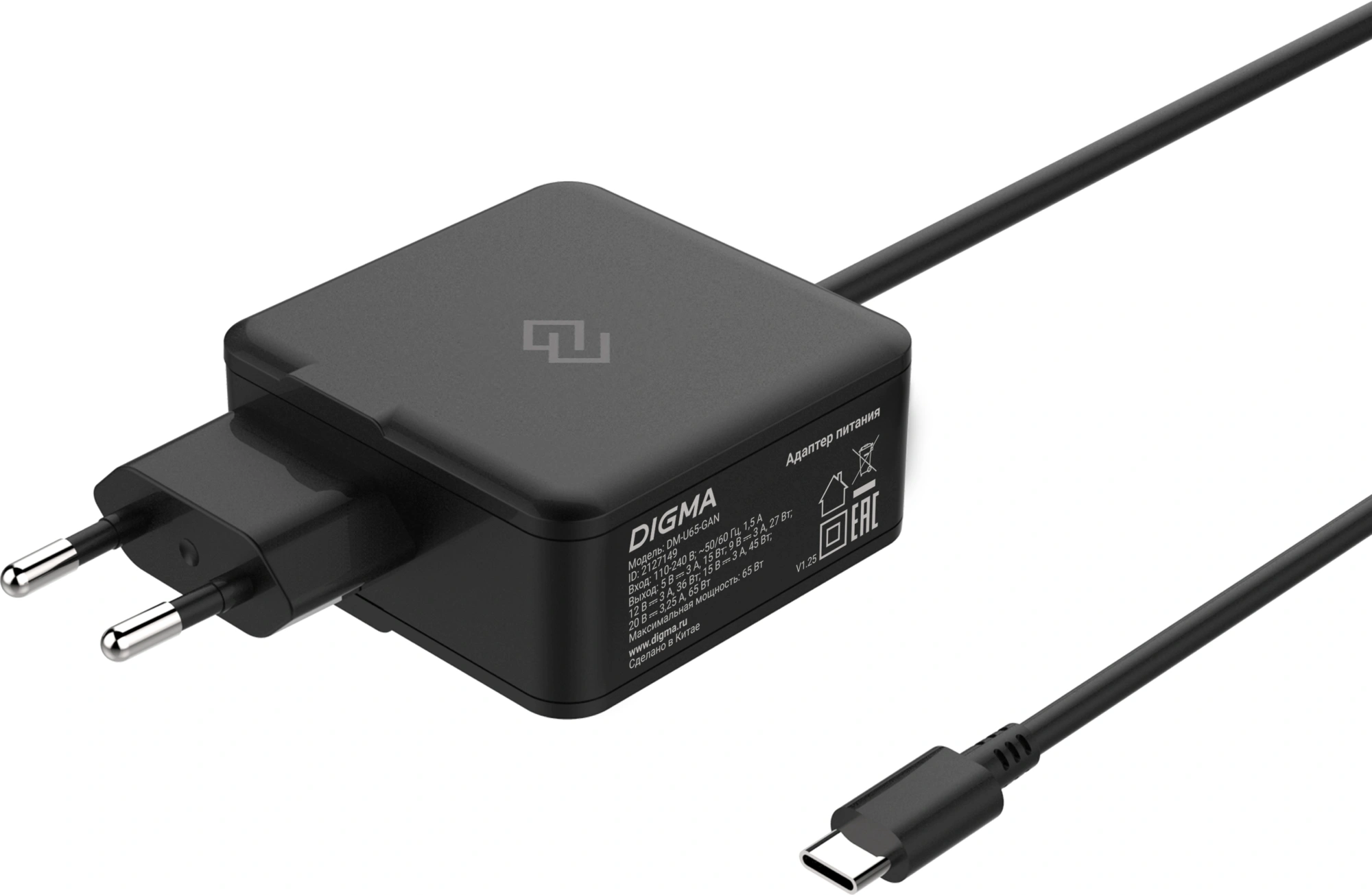 Блок питания Digma DM-U65-GAN автоматический 65W 5V-20V 3.25A от бытовой электросети