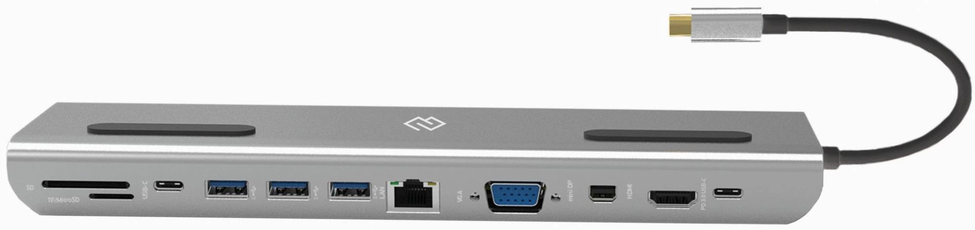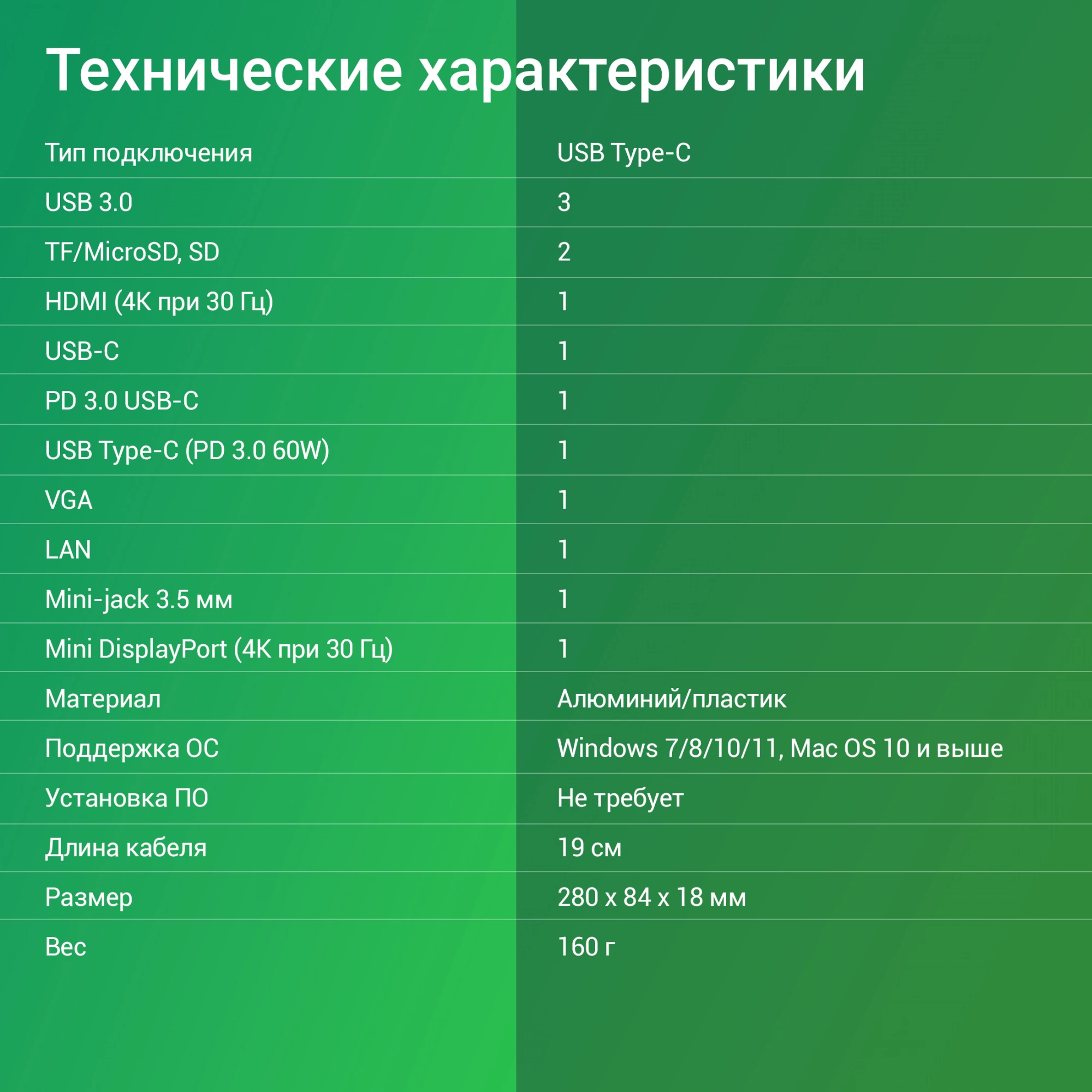 | Особенности | Mini DisplayPort (4K@30HZ, FULL HD@60Hz). Поддержка карт памяти microSD и SD. Дополнительный порт USB Type-C с поддержкой PowerDelivery 3.0 60Вт. Длина кабеля - 19 см. Не требует дополнительного питания |
