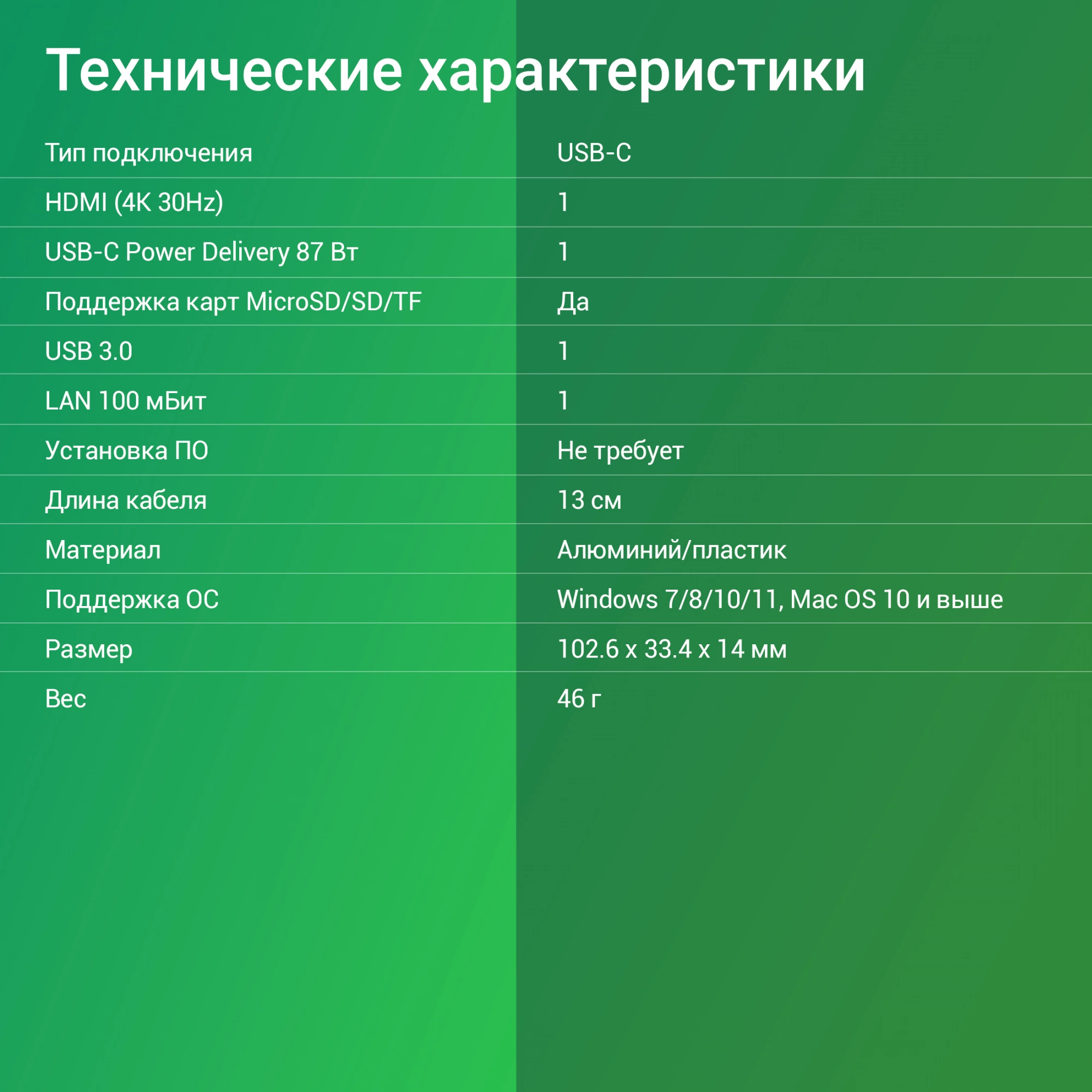 | Особенности | Длина кабеля 13см. Не требует дополнительного питания |