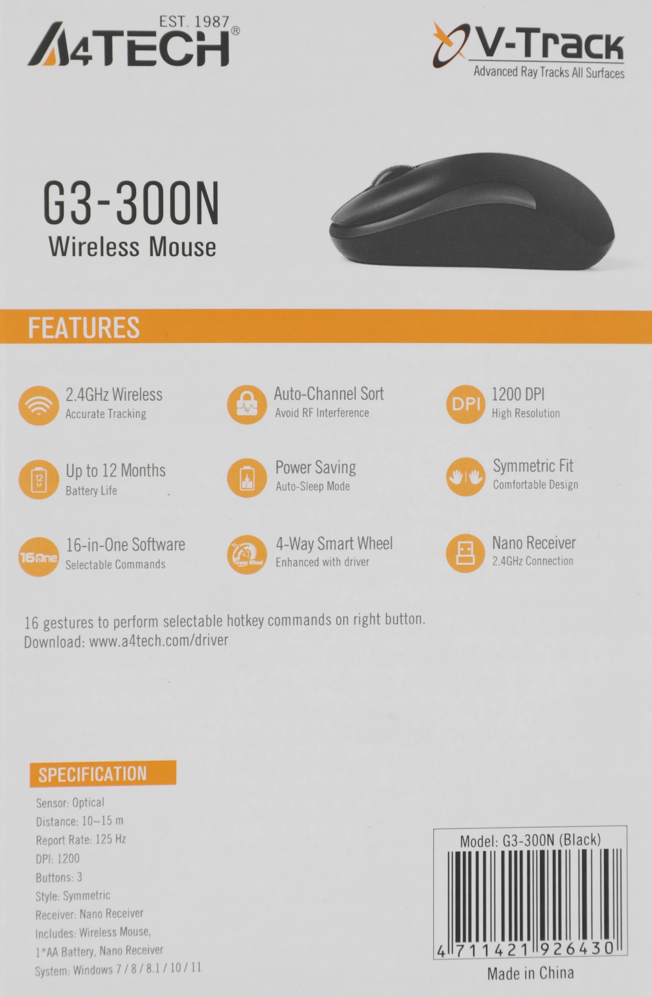 Мышь A4Tech V-Track G3-300N черный оптическая (1200dpi) беспроводная USB для ноутбука (3but)