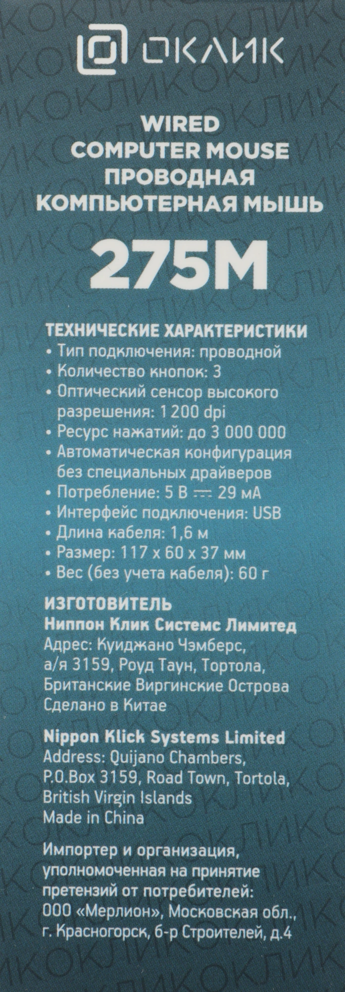 Мышь Оклик 275M черный оптическая (1000dpi) USB (3but)