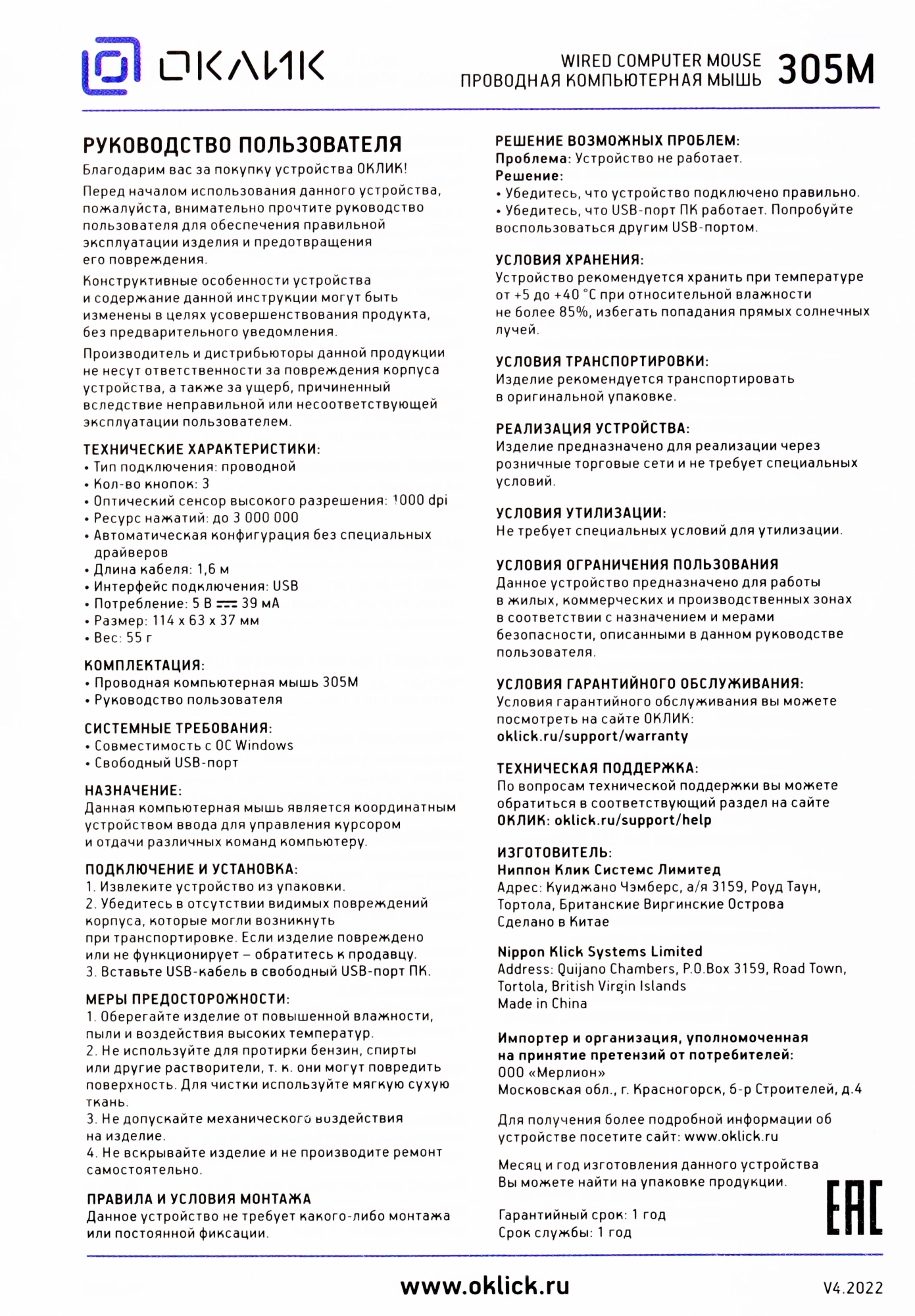| Комплектация | Проводная компьютерная мышь 305M |