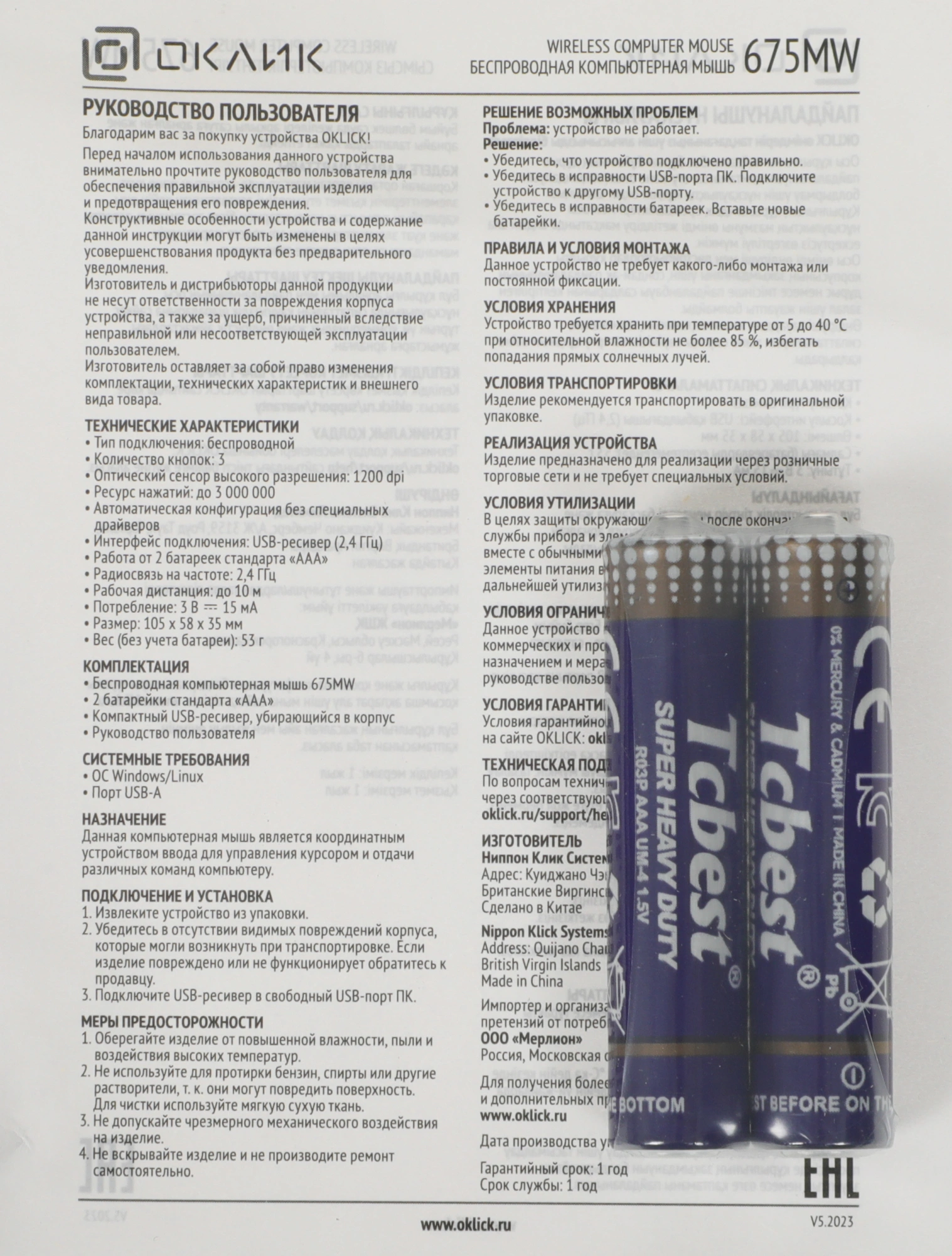 | Комплектация | Беспроводная компьютерная мышь 675MW 2 батарейки стандарта ААА Компактный USB-ресивер |