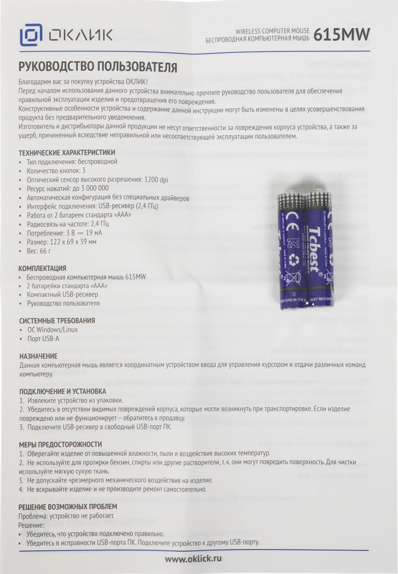 | Комплектация | Беспроводная компьютерная мышь 615MW 2 батарейки стандарта ААА в комплекте. Компактный USB-ресивер. |