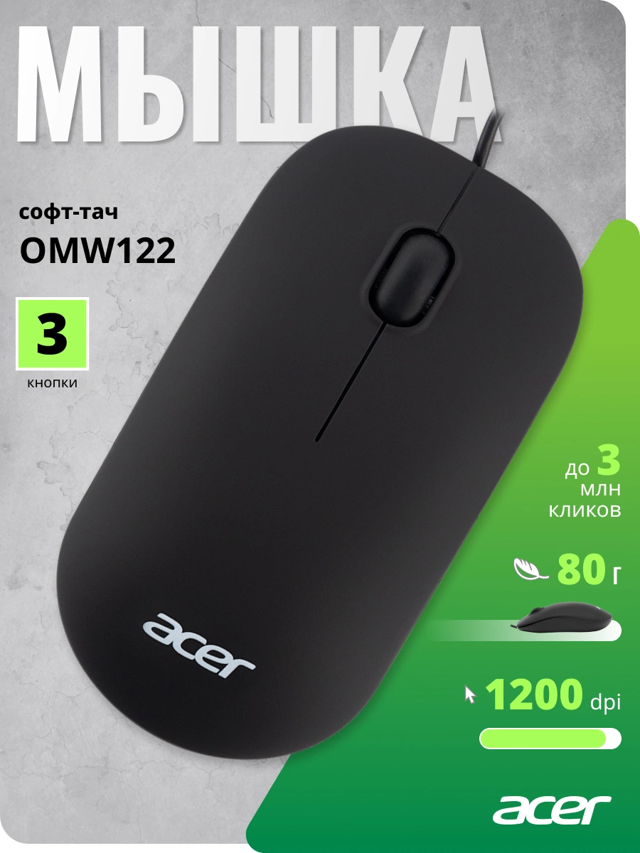 Мышь Acer OMW122 черный оптическая (1200dpi) USB (3but)