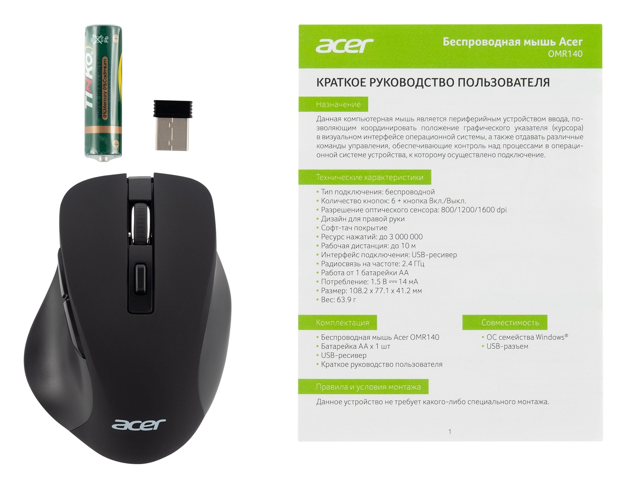 | Комплектация | Беспроводная мышь Батарейка АА х 1 шт USB-ресивер Краткое руководство пользователя |