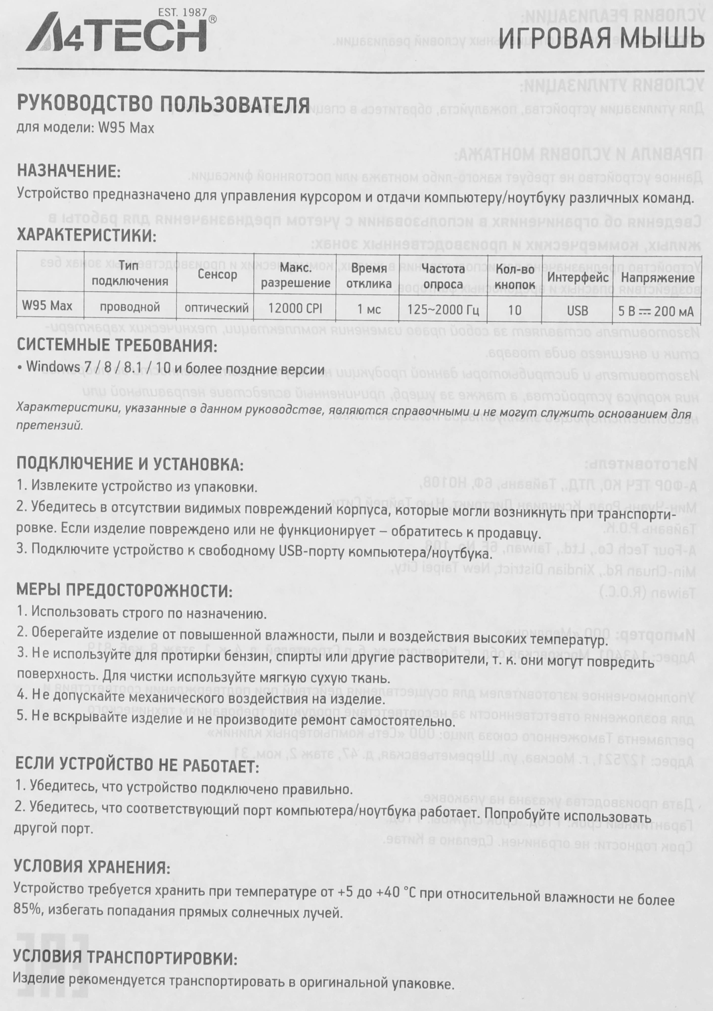 | Частота опроса USB порта | 125/500/1000/2000 |