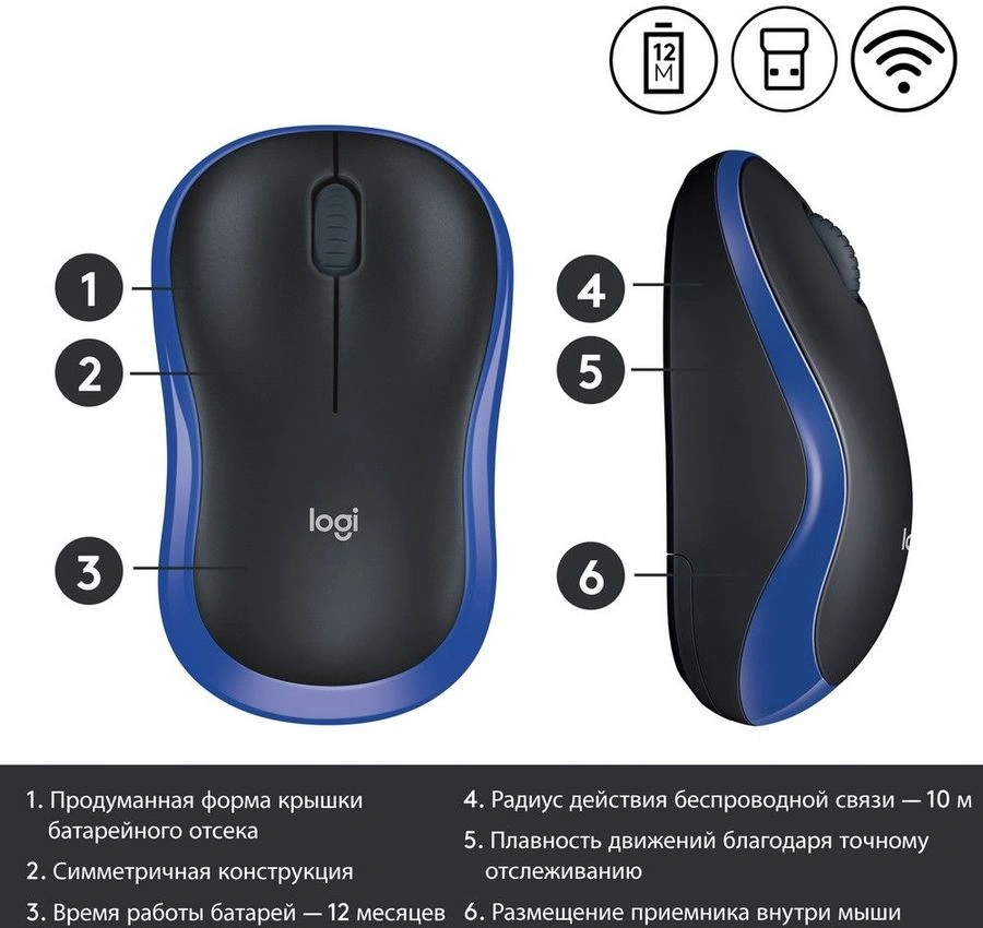 Мышь Logitech M185 черный/синий оптическая (1000dpi) беспроводная USB1.1 для ноутбука (2but)