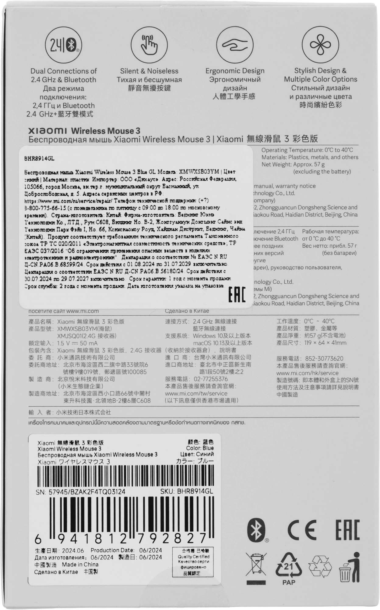 Мышь Xiaomi Wireless Mouse 3 синий оптическая 1200dpi silent беспров. BT/Radio USB для ноутбука 4but (BHR8914GL)