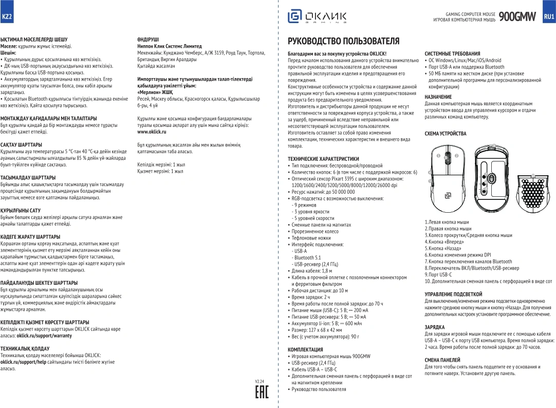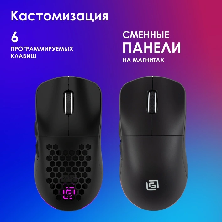 | Особенности | Сенсор PixArt PAW3395. Три режима подключения - 2,4G + BlueTooth + провод, 600 mAh, 50 млн кликов, RGB. ПО для дополнительной настройки. |