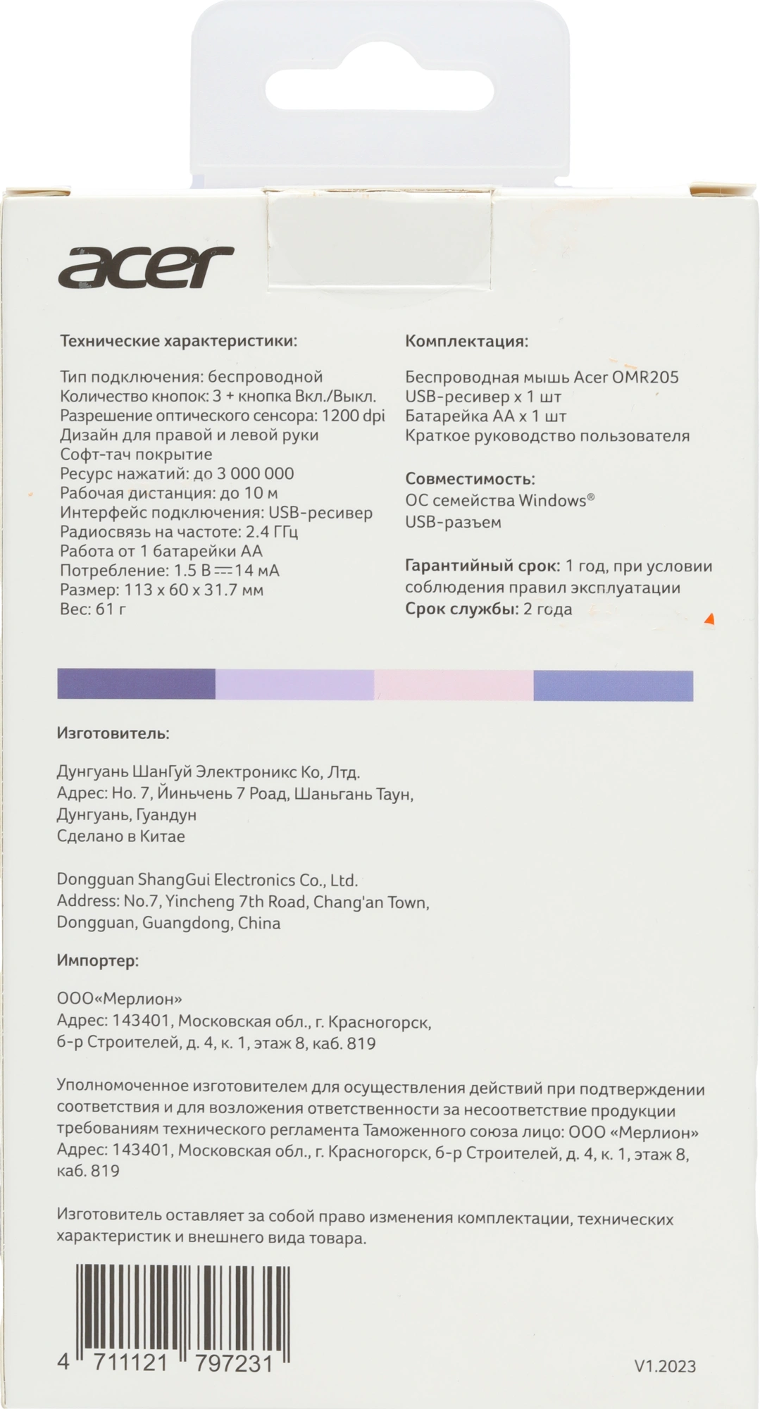 | Комплектация | Беспроводная мышь Батарейка АА х 1 шт USB-ресивер Краткое руководство пользователя |