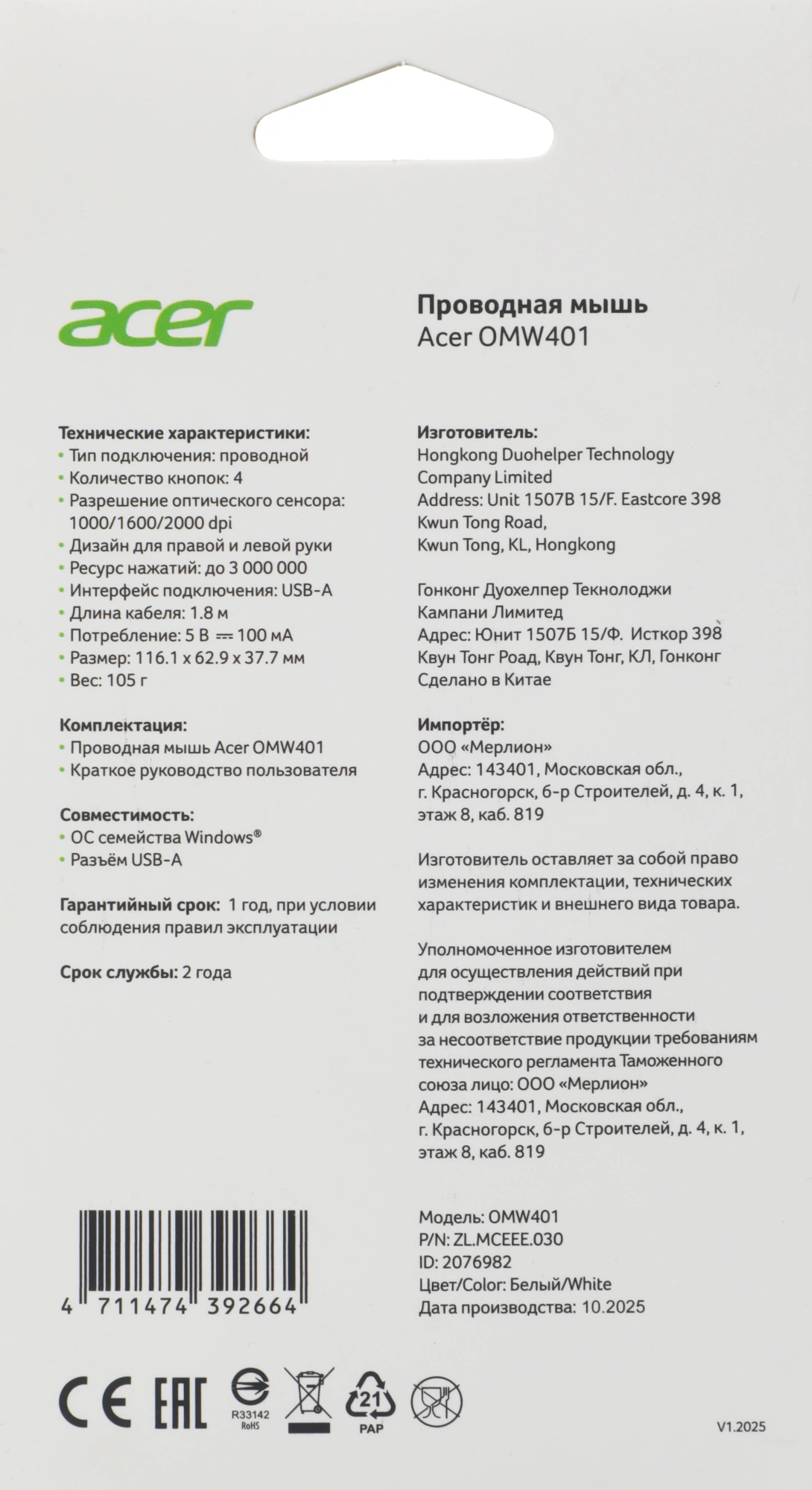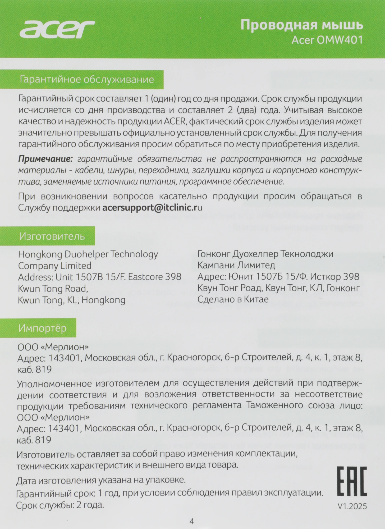 Мышь Acer OMW401 белый оптическая 2000dpi USB 4but (ZL.MCEEE.030)