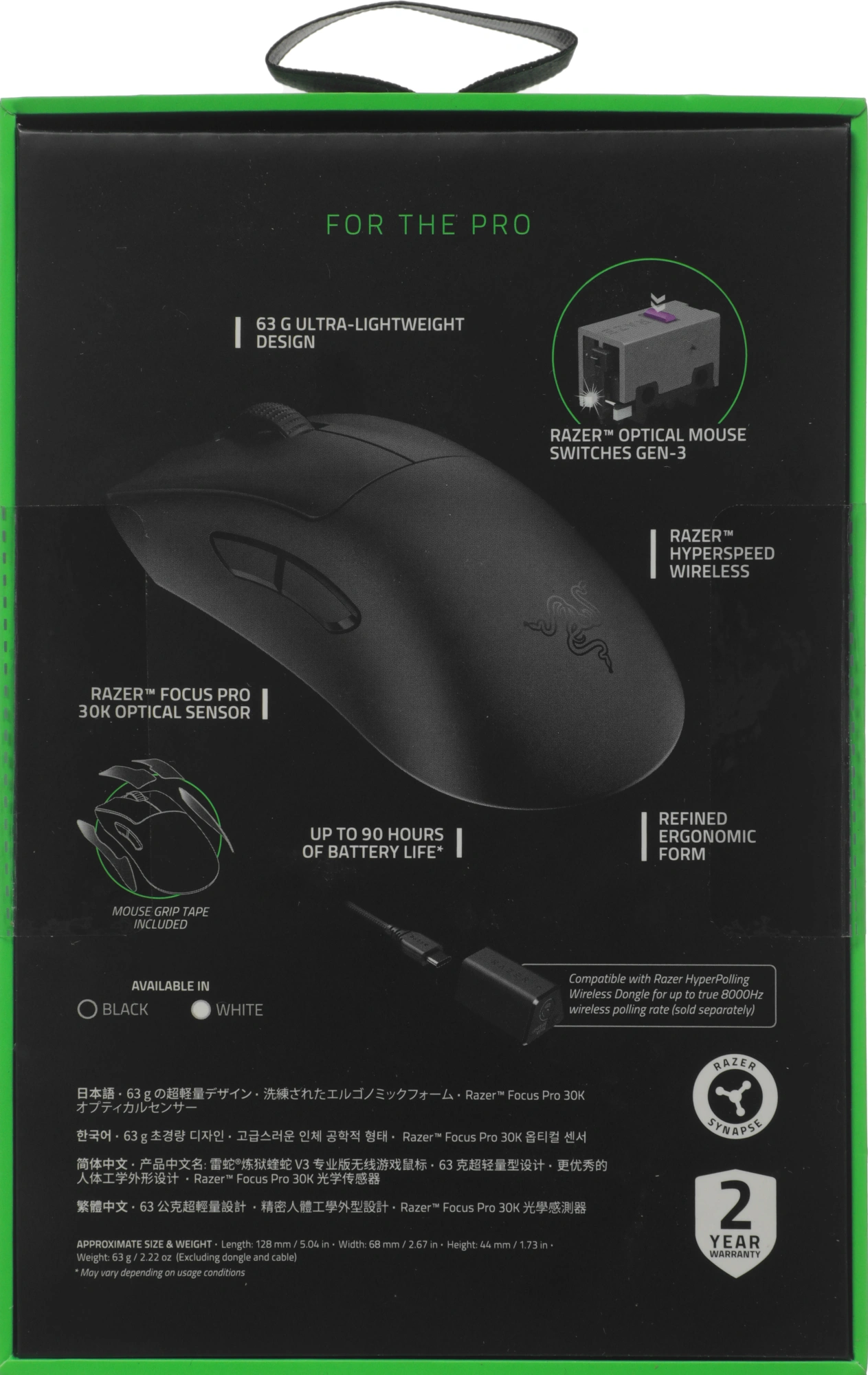 | Особенности | Беспроводная связь Razer Hyperspeed или проводной режим. 5 программируемых кнопок. Сверхлегкая 63 грамма. Оптический сенсор Razer Focus Pro 30 000 DPI. |
