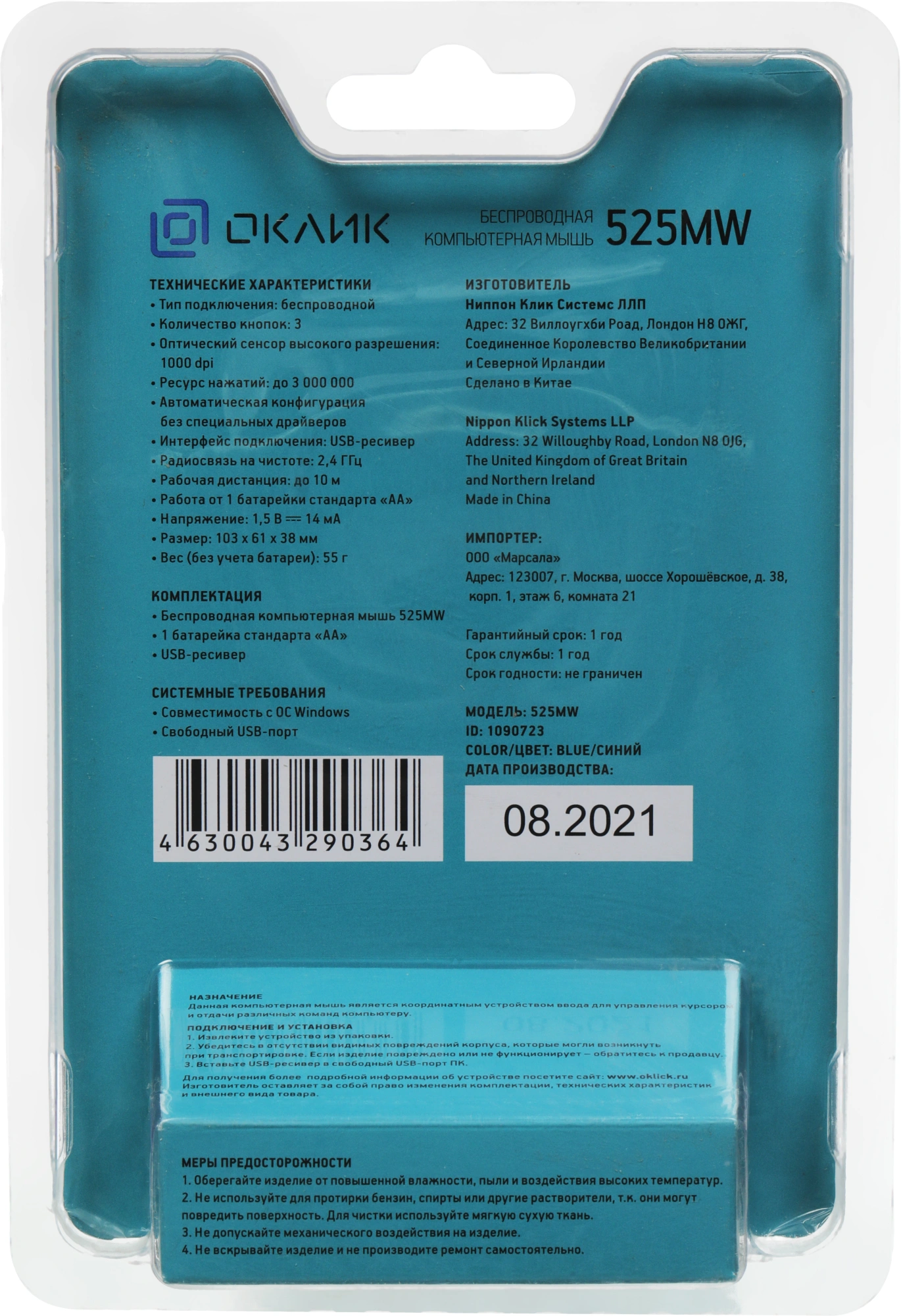 | Комплектация | Беспроводная компьютерная мышь 525MW, 1 батарейка "AA", USB-ресивер |