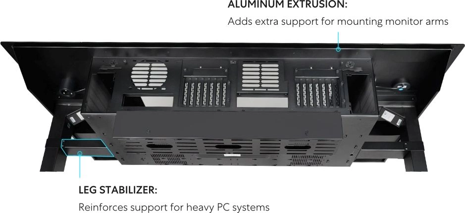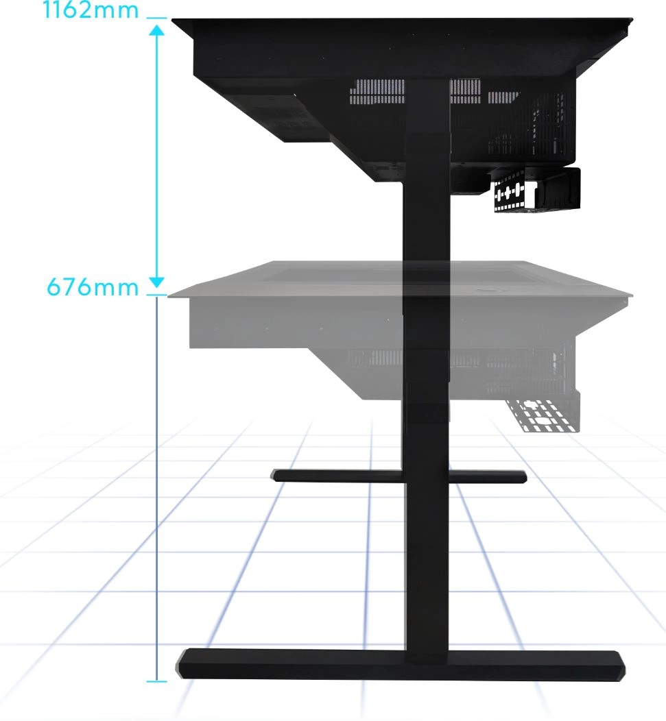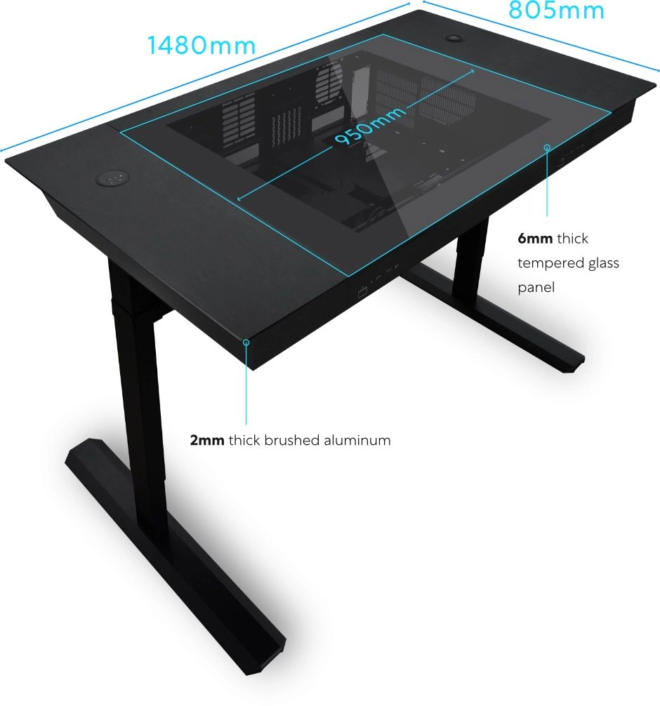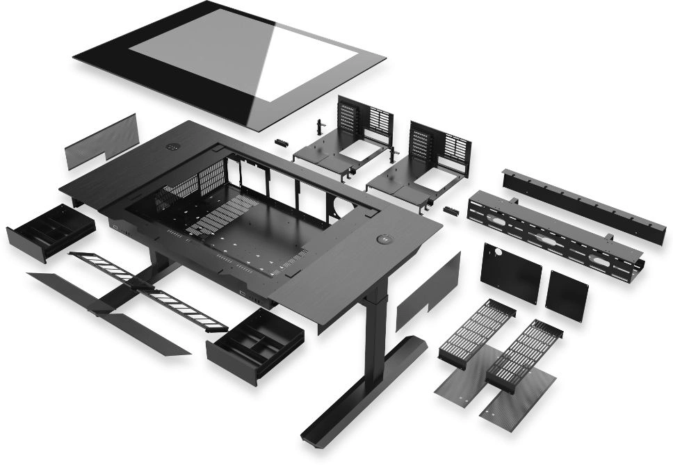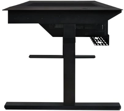 | Особенности | Стол со встроенным корпусом. Регулируемая высота от сидячего до стоячего положения с помощью электродвигателя. Оснащен беспроводной зарядной панелью и 2 организованными ящиками. Поддерживает до 2 материнских плат E-ATX с 2 блоками питания ATX |