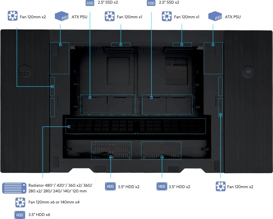 | Совместимость СВО | Двойная система: Спереди: 360 x 2 / 280 x 2 / 360 / 280 / 240 / 140 / 120 мм радиатор. Одинарная система: Посередине справа: 360 / 240 / 120 мм радиатор. Спереди: 360 x 2 / 280 x 2 / 360 / 280 /240 /140 / 120 мм радиатор. Посередине слева: 360 / 240 / 120 мм радиатор. |