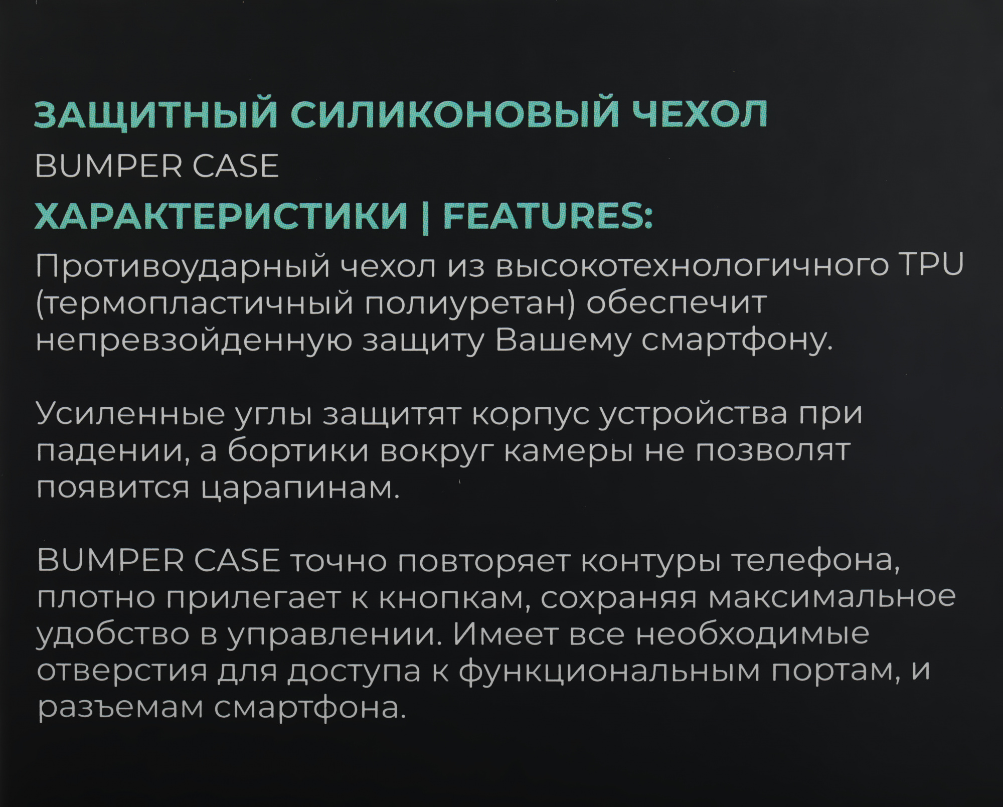 | Описание | Прозрачный противоударный силиконовый чехол Bumper Case c усиленными углами и защитным бортом надёжно защитит корпус Вашего устройства от царапин, грязи и механических повреждений. Имеет все необходимые отверстия для доступа к функциональным портам и разъемам. |