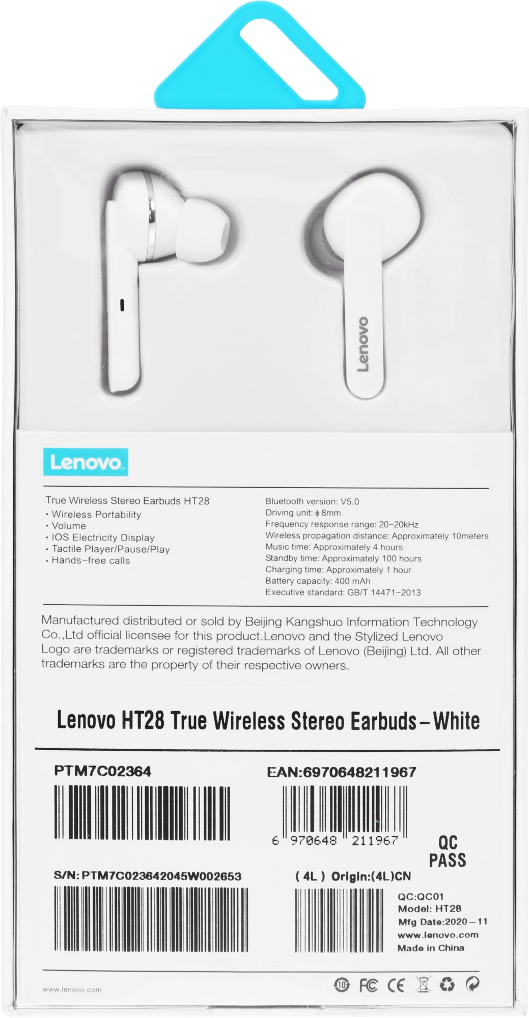 Гарнитура внутриканальные Lenovo HT28 белый беспроводные bluetooth в ушной раковине (УТ000023560)