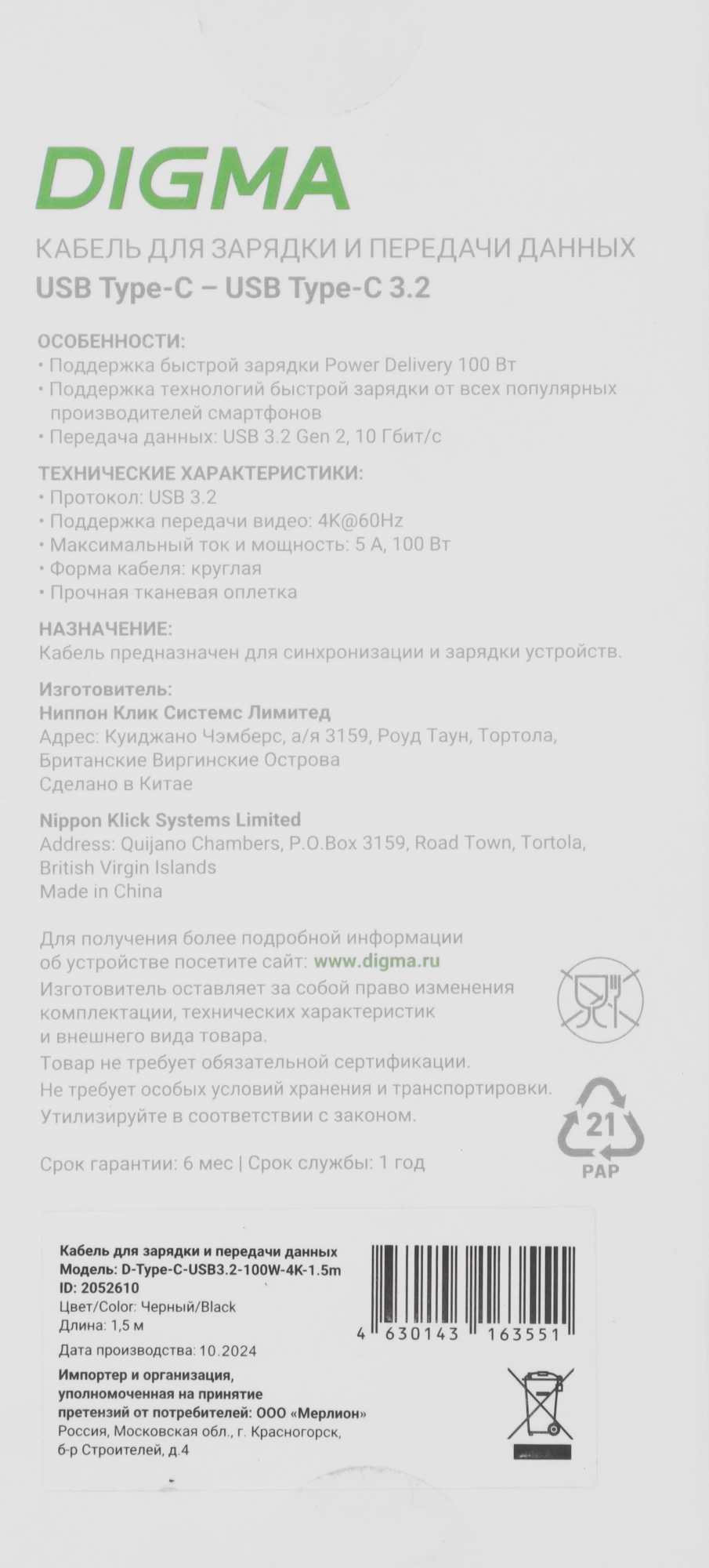 | PartNumber/Артикул Производителя | D-TYPE-C-USB3.2-100W-4K-1.5M |