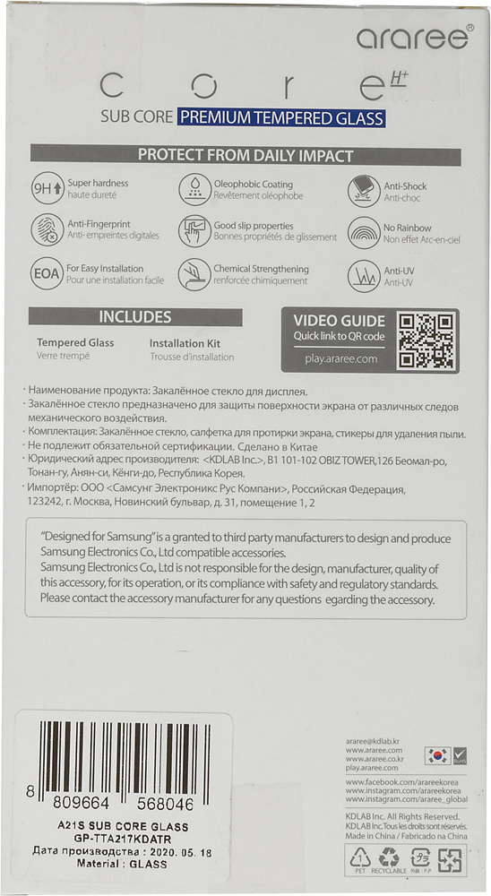 Защитное стекло для экрана Samsung araree by KDLAB для Samsung Galaxy A21s прозрачная 1шт. (GP-TTA217KDATR)