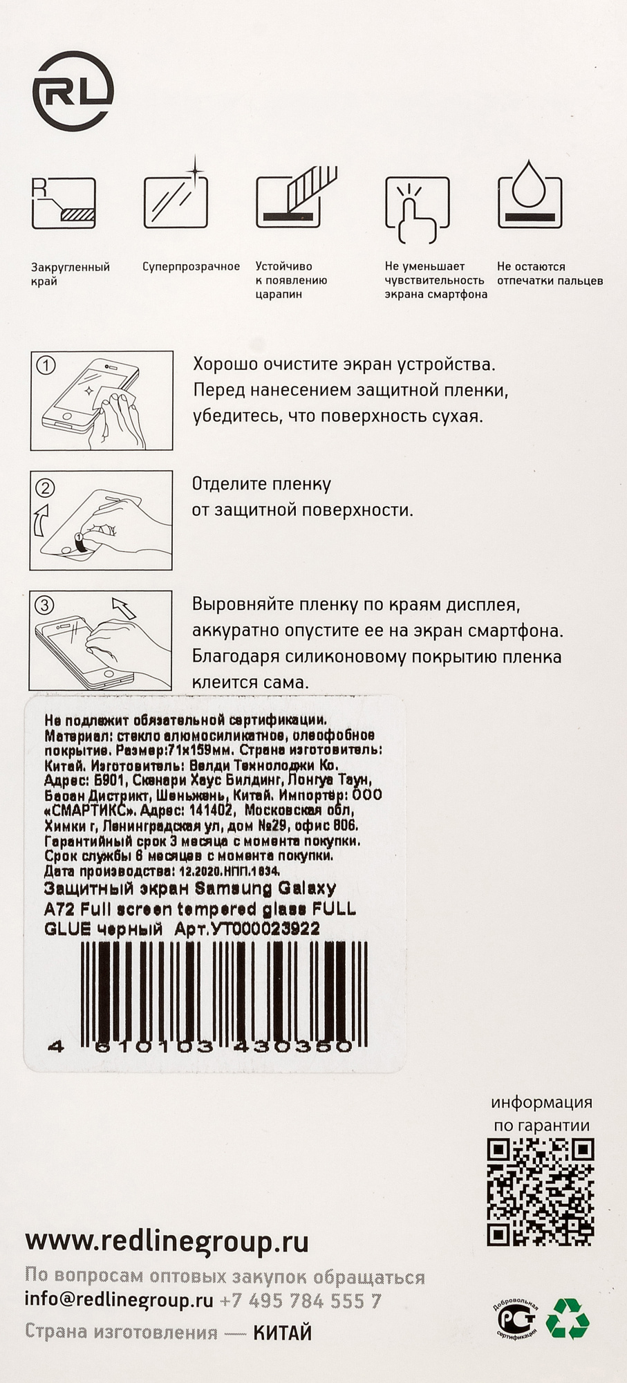 Защитное стекло для экрана Redline прозрачный для Samsung Galaxy A72 1шт. (УТ000023922)