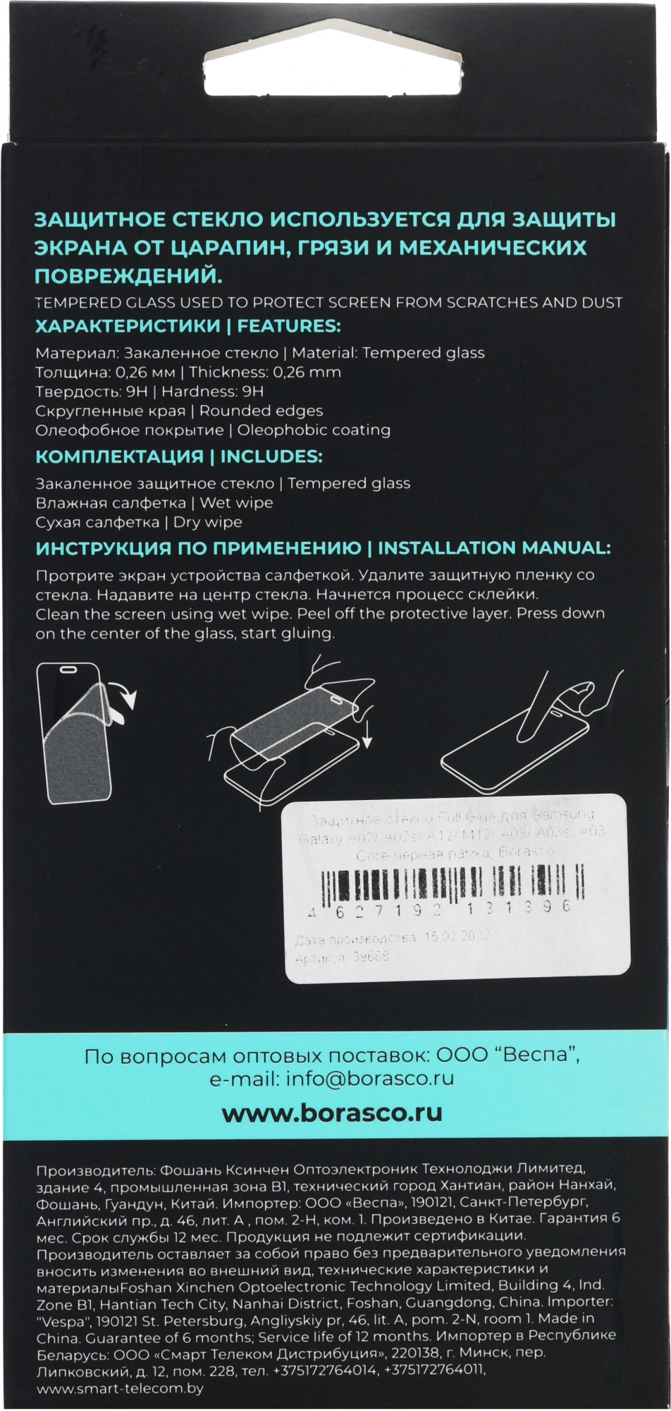 Защитное стекло для экрана BoraSCO 39688 черный для Samsung Galaxy A02/A02s/A12/M12/A03/A03s/A03 Core 1шт.