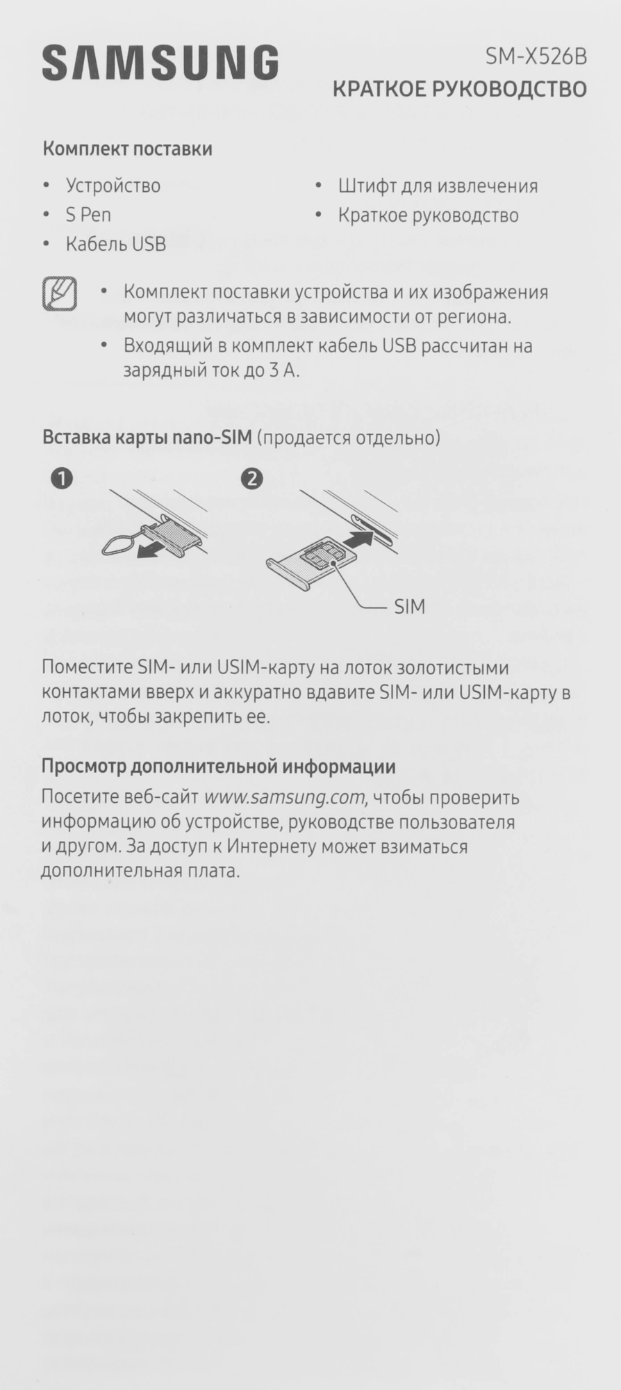 | Комплект поставки | Планшет, электронное перо S Pen, кабель Type-C (m) - Type-C (m), скрепка для извлечения лотка, документация |