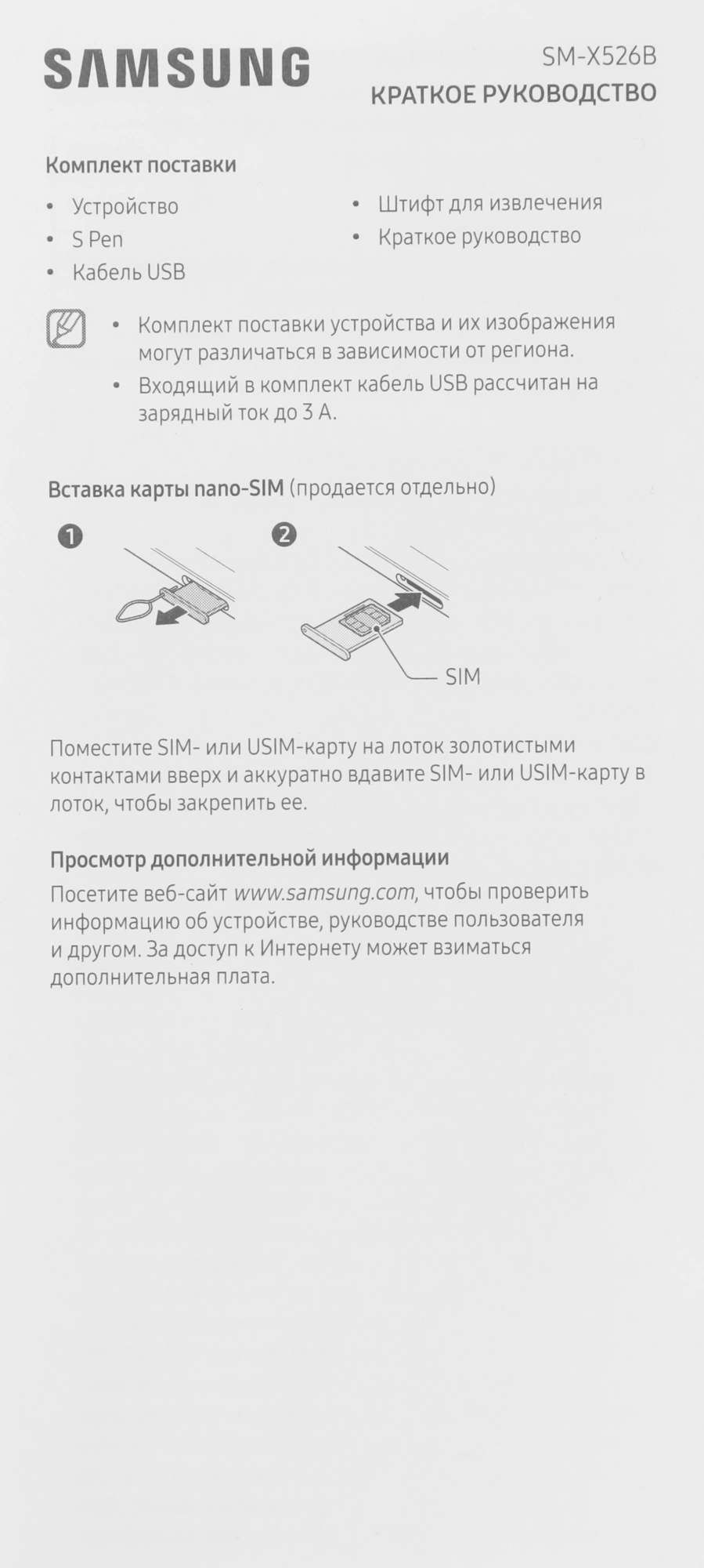 | Комплект поставки | Планшет, электронное перо S Pen, кабель Type-C (m) - Type-C (m), скрепка для извлечения лотка, документация |
