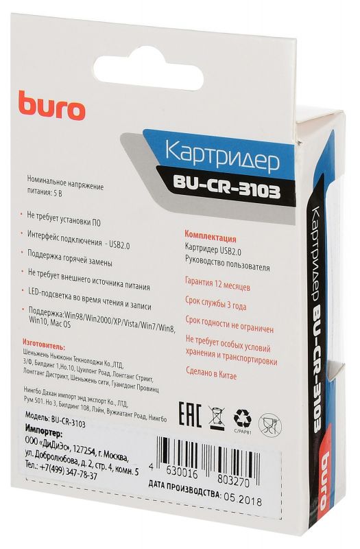 Устройство чтения карт памяти USB2.0 Buro BU-CR-3103 черный