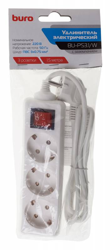 Сетевой удлинитель Buro BU-PS3.1/W 1.5м (3 розетки) белый (пакет ПЭ) (10 шт. в упаковке)