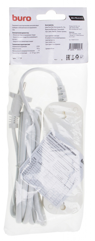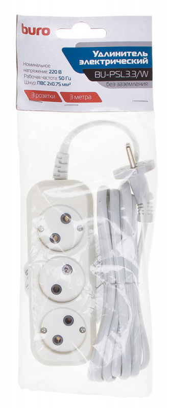 Сетевой удлинитель Buro BU-PSL3.3/W 3м (3 розетки) белый (пакет ПЭ) (10 шт. в упаковке)