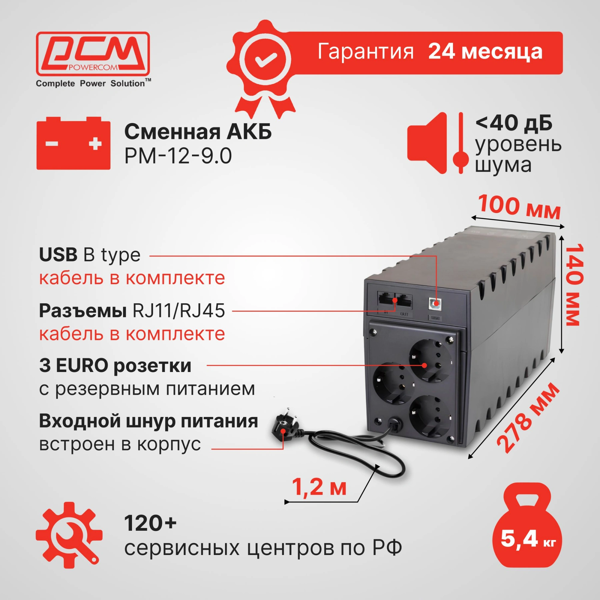 Источник бесперебойного питания Powercom RPT-1000AP EURO USB 600Вт 1000ВА