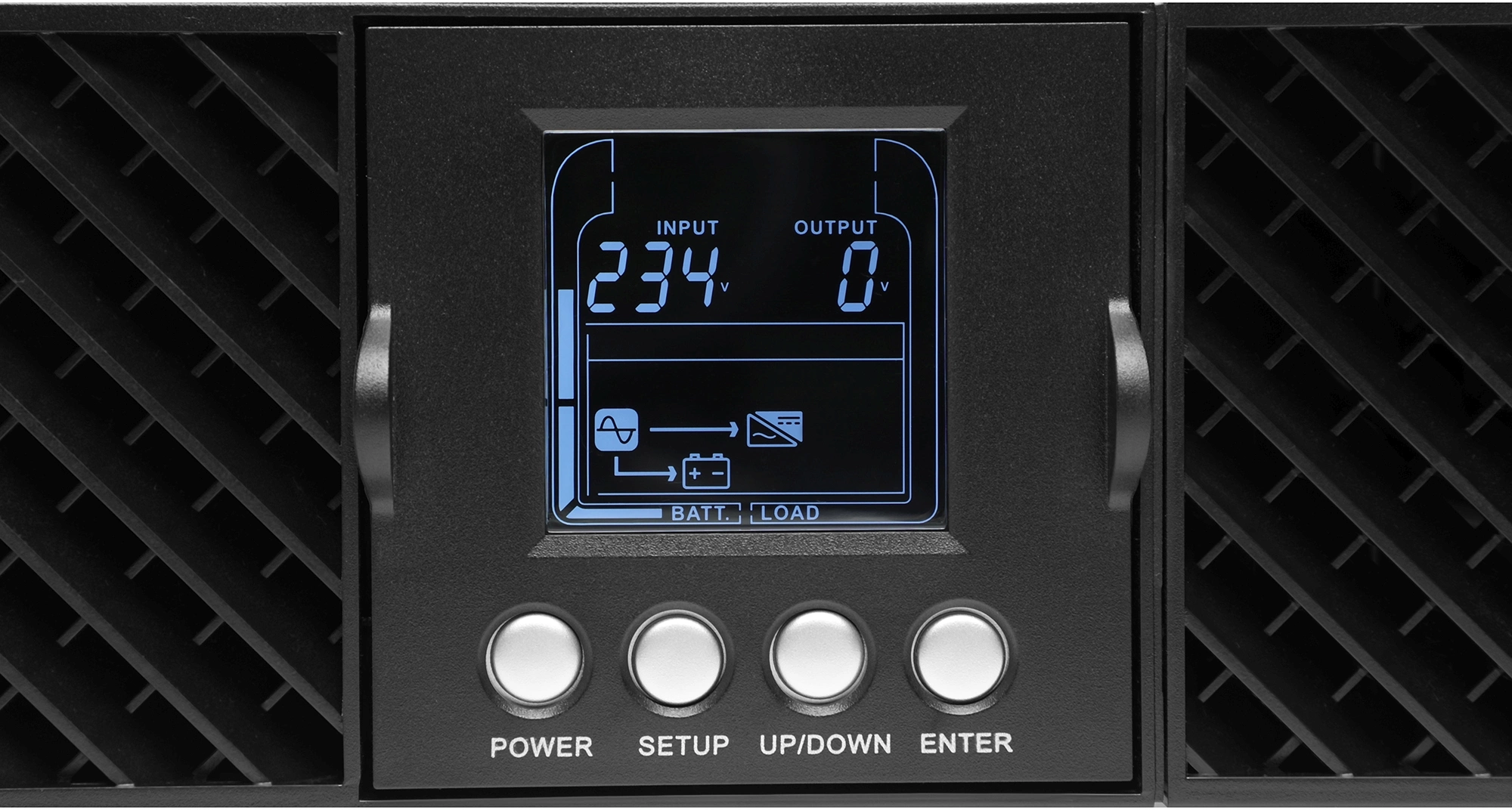 | Индикация состояния | ЖКИ с подсветкой, отображающий цифровую величину входного и выходного напряжения, а также величину нагрузки и остаточной емкости батареи, пиктограммы индикации питания от сети, от батареи, режим регулятора |