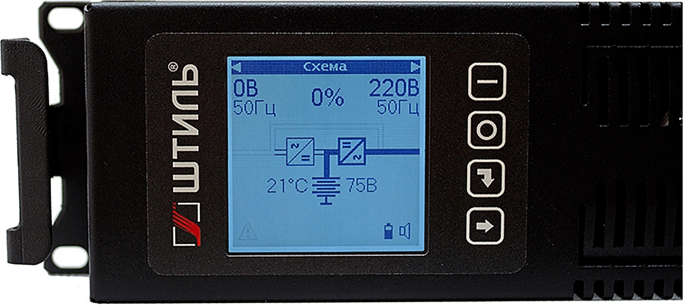 | Индикация состояния | Отображение рабочего состояния системы и основных входных и выходных параметров. Звуковой сигнал: автономный режим (каждые 4 с), низкое напряжение АБ (каждые 2 с), батарея от- соединена/полностью разряжена/нужда- ется в замене (каждые 0,5 с), перегрузка и неисправность ИБП (непрерывно) |