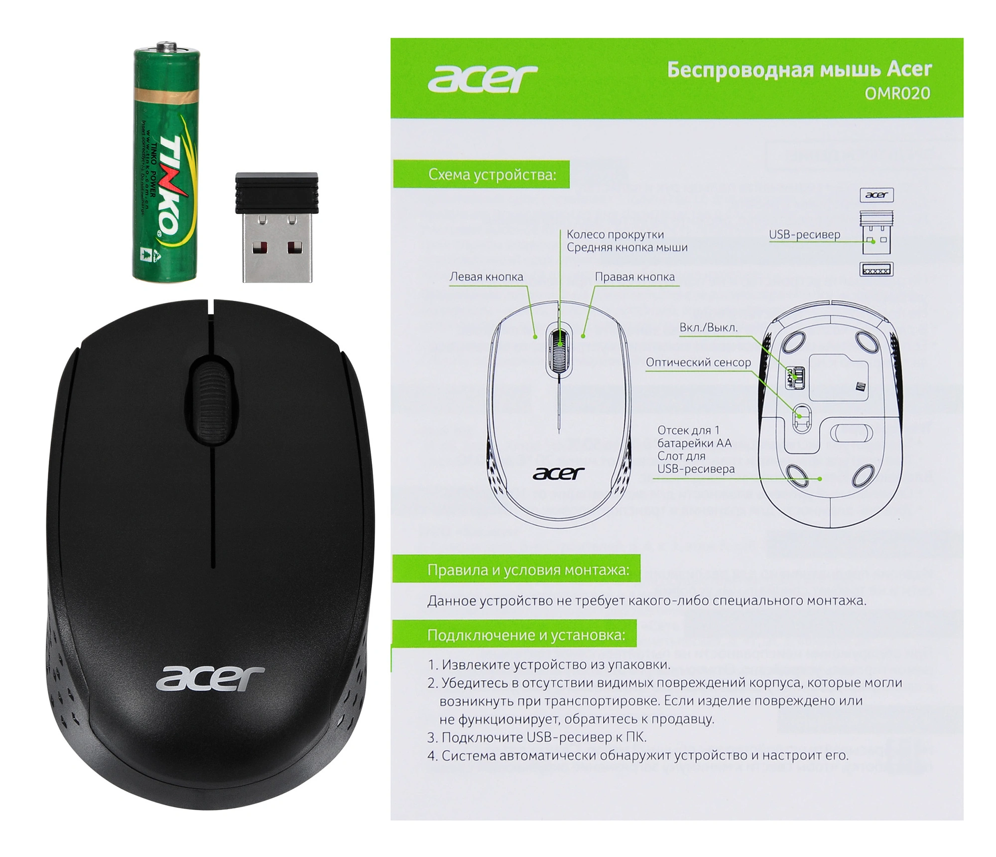 | Комплектация | Беспроводная мышь Батарейка АА х 1 шт USB-ресивер Краткое руководство пользователя |