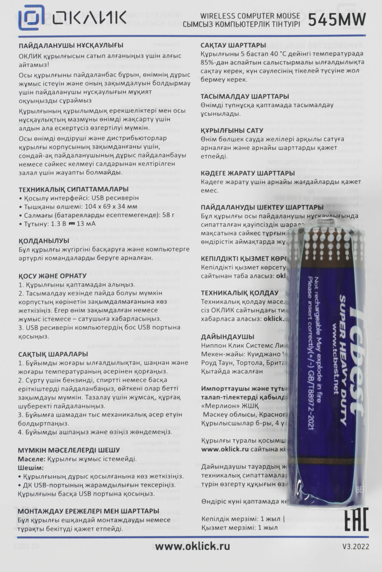 | Комплектация | Беспроводная компьютерная мышь 545MW 1 батарейка стандарта AA Компактный USB-ресивер |